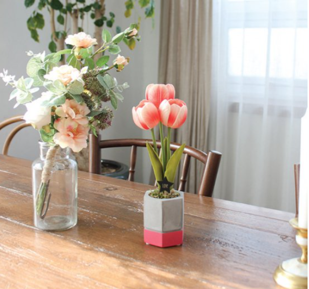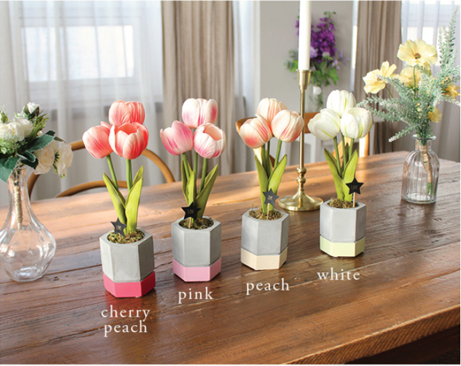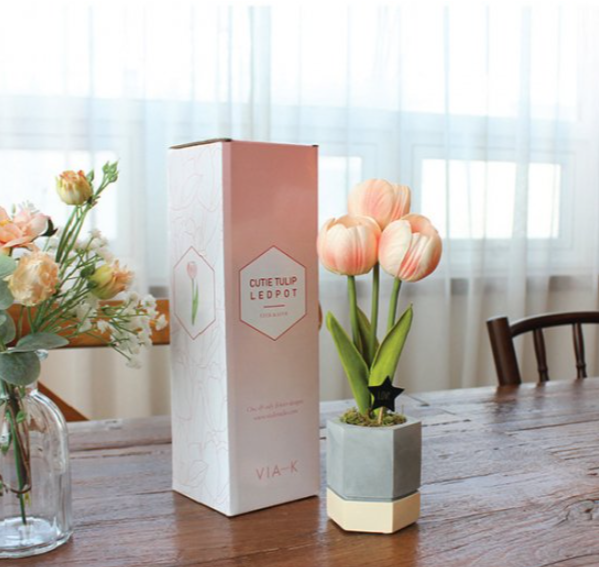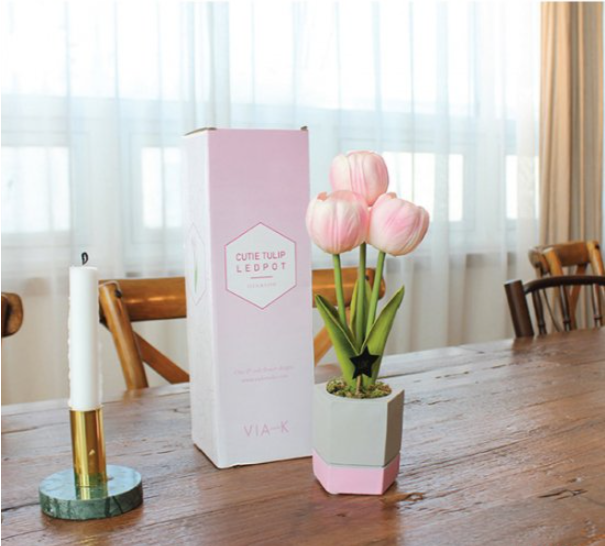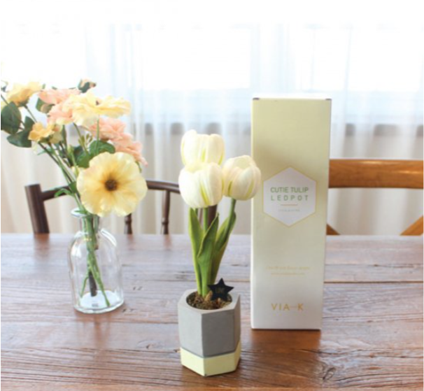 2007年に韓国で設立したインテリア雑貨のデザインスタジオ「VIA K STUDIO(ヴィアケースタジオ)」のキューティーチューリップポットLEDです。丸みのあるチューリップ3輪が、コンクリート製のポットに入っています。茎にワイヤーが入っているのでお好みの角度に変えられます。お花ギフトとしてもご利用いただけます。