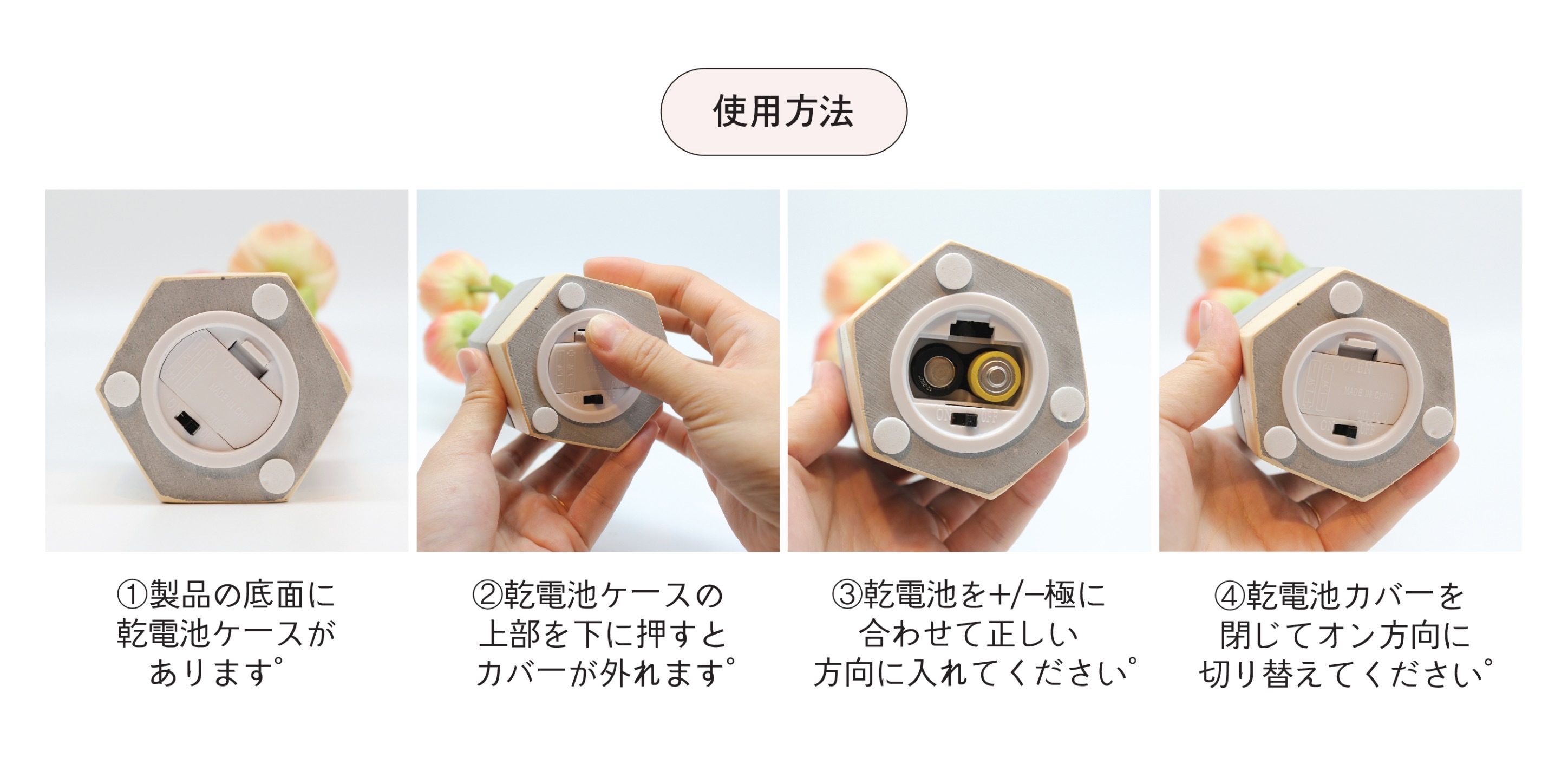 1.鉢の下側にバッテリーを入れるところがあります。 2.フタを開けて外し、テスト電池の単3電池が2個入っていることを確認したらバージンシールを外します。 3.キャップを再度はめて、ON/OFFボタンをONにすると灯ります。 (バージンシールを外さないとライトはつきません。ご注意ください。) ※商品にはテスト電池が入っています。