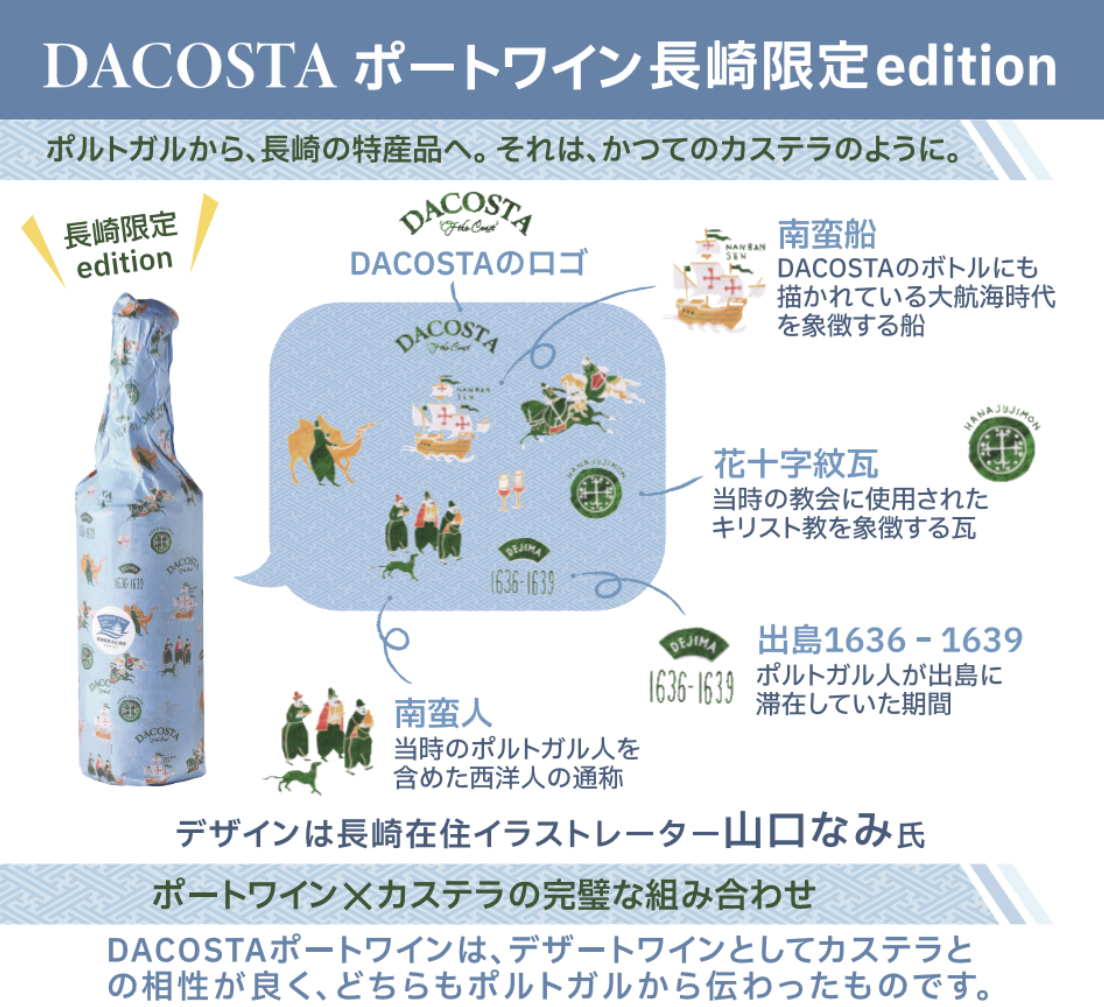 ワインの国際難関資格WSETディプロマを持つ店長のポルトガルワイン専門店「ポルトガル・トレード」の開国450年を記念したポートワインです。「ダコスタ・タウニー」を長崎在住のイラストレーター山口なみ氏による限定パッケージでお届けします。※20歳未満の方への酒類の販売は法律で禁止されています。