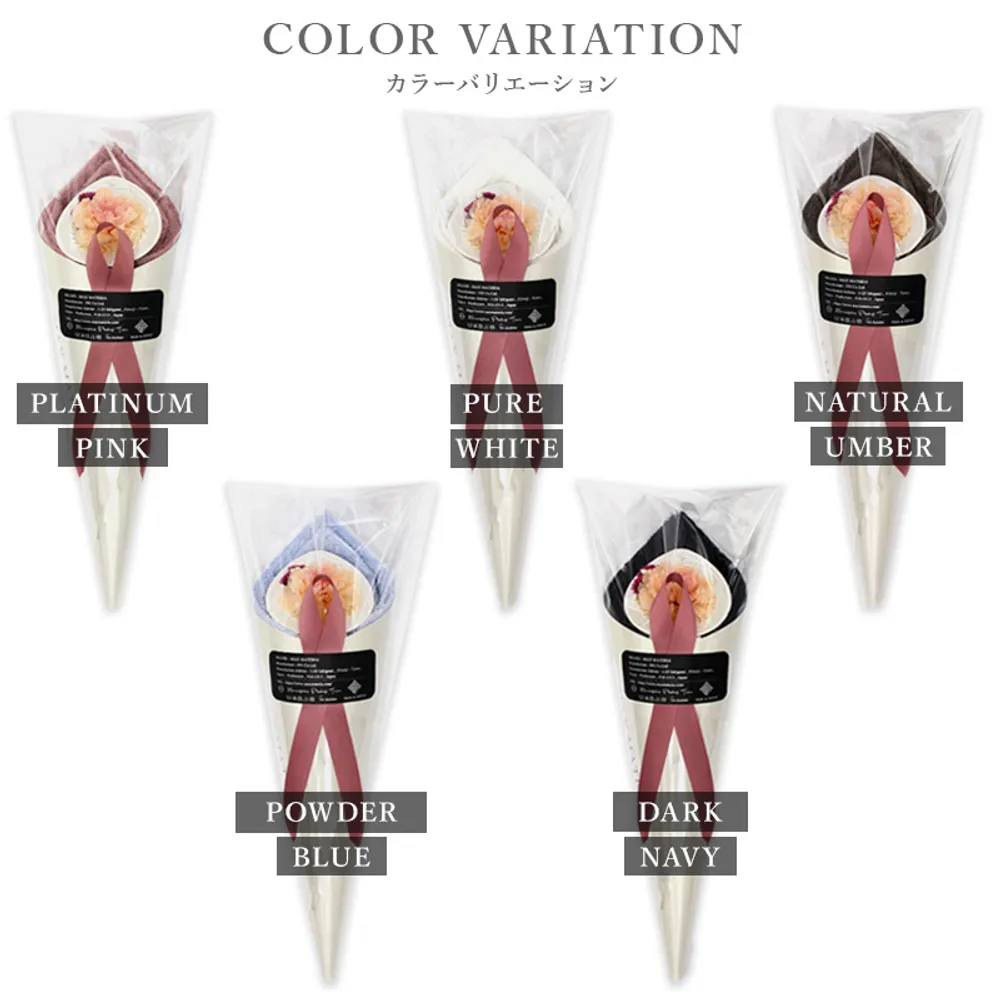 生花のように美しい色のドライフラワーと同系色のタオルのカラーを選べば”大人な雰囲気”に、反対色を選んで”カジュアルな雰囲気”にもなります。 高級感のあるデザインでテイストを選べるのも、タオル花束の人気の一つです。
