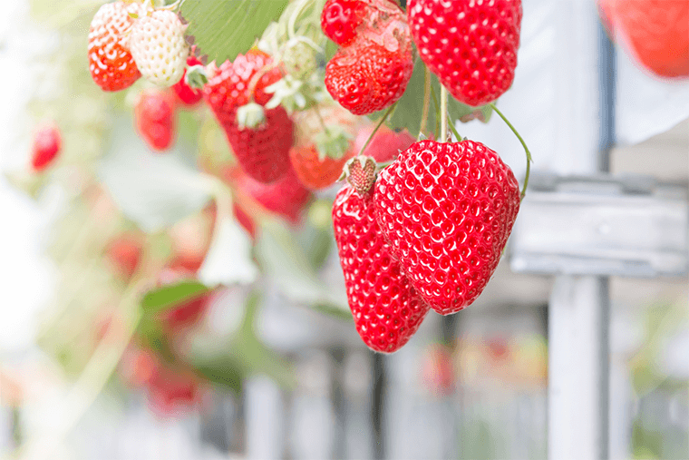 「スカイベリー」の名称には、“「大きさ、美しさ、おいしさ」の全てが大空に届くような素晴らしいいちご”という意味が込められており、栃木県にある百名山の一つ「皇海山」(すかいさん)も名前の由来のひとつです。 形は円錐形で色は明るい色で光沢があります。25g以上のものが約3分の2を占めており、大きいという特徴があります。 味は甘味と酸味のバランスがよく、噛むとまろやかでジューシーな食感です。