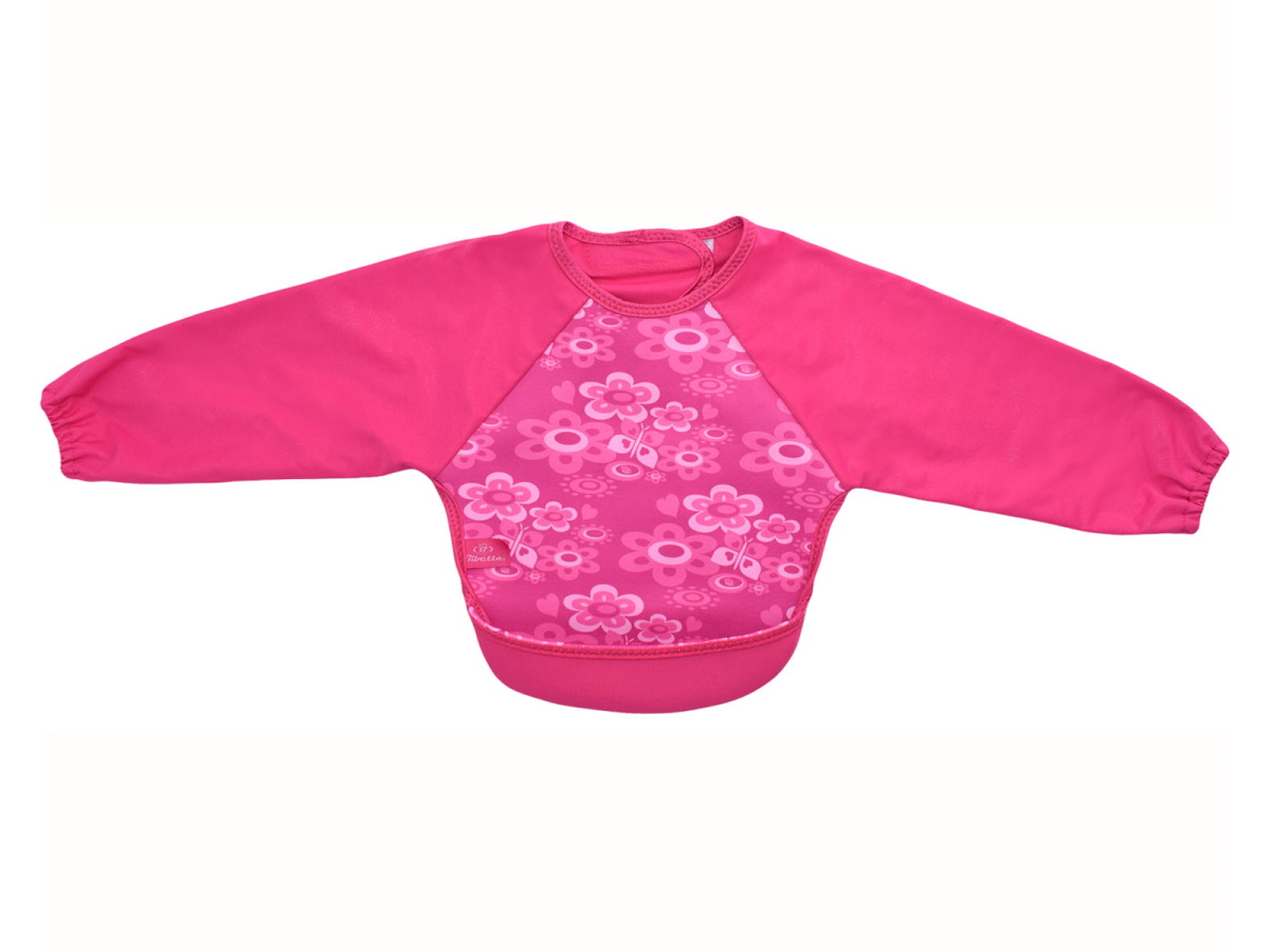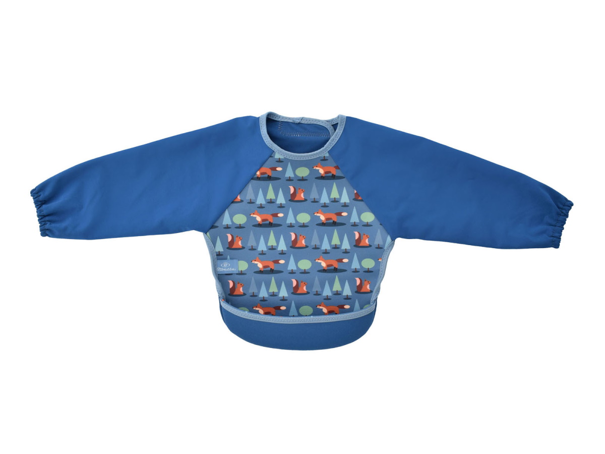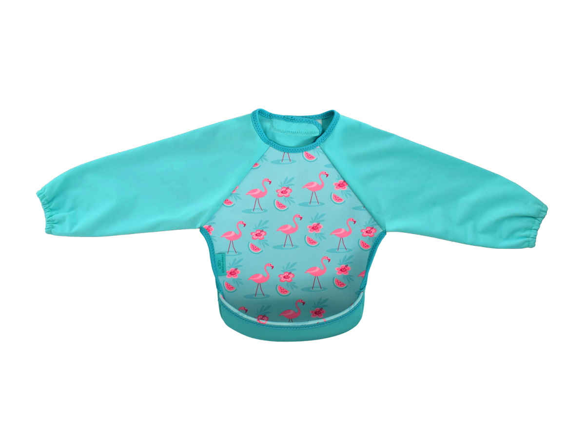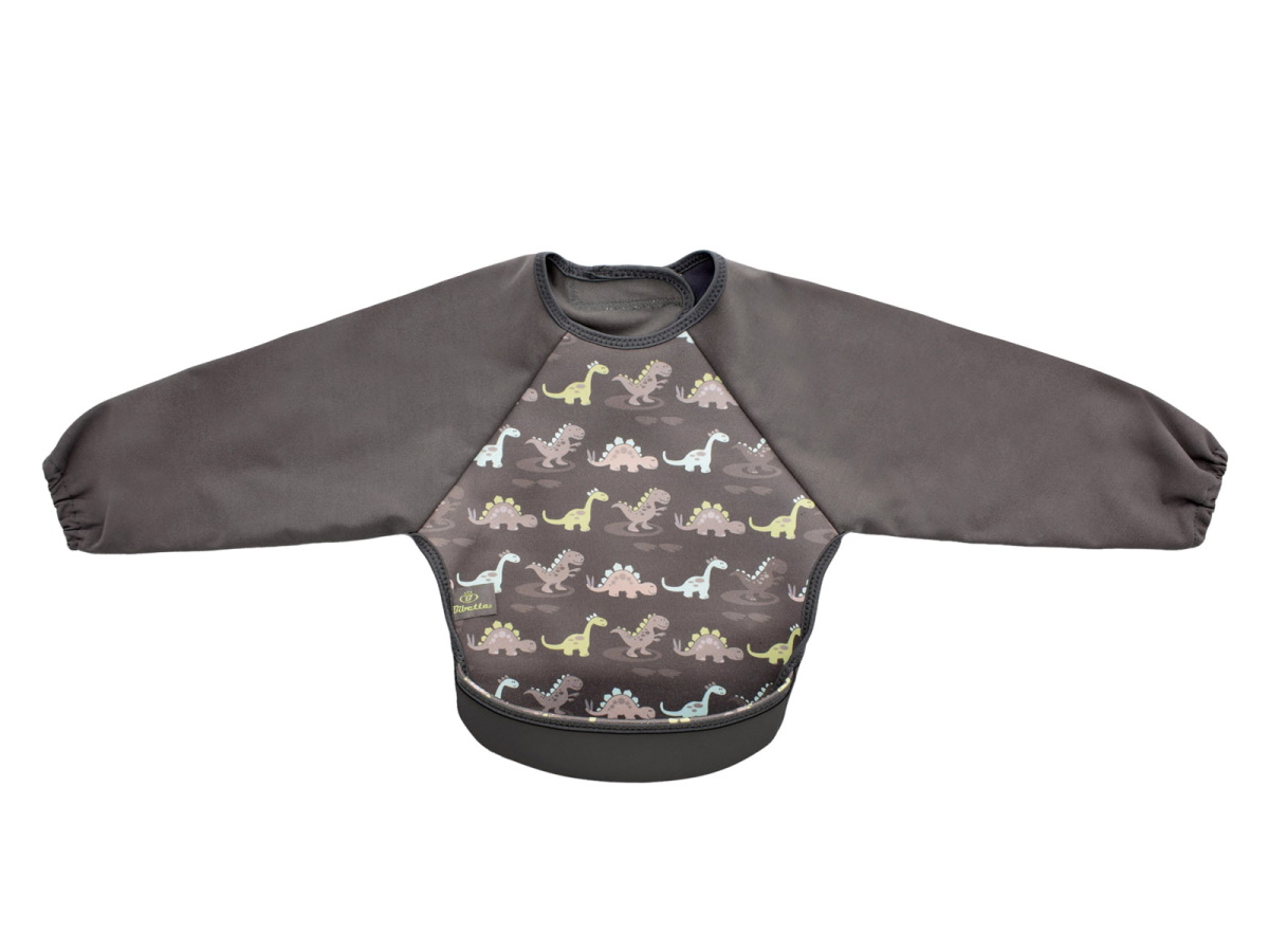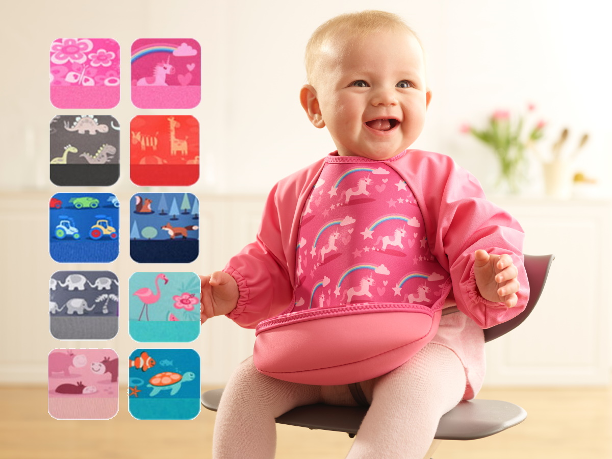 ウェットスーツ素材と防水素材でできた、とっても軽くて軟らかい袖付きのベビー用エプロンです。裾をまくれば、立体的で大きな食べこぼしキャッチ用ポケットが登場!床に落ちる食べこぼしも減るので、お掃除も楽ちん。