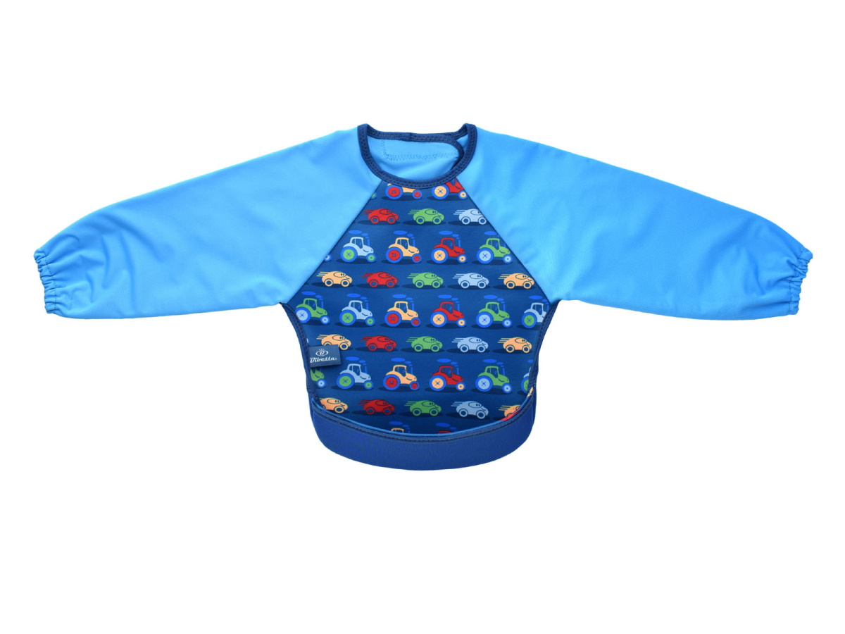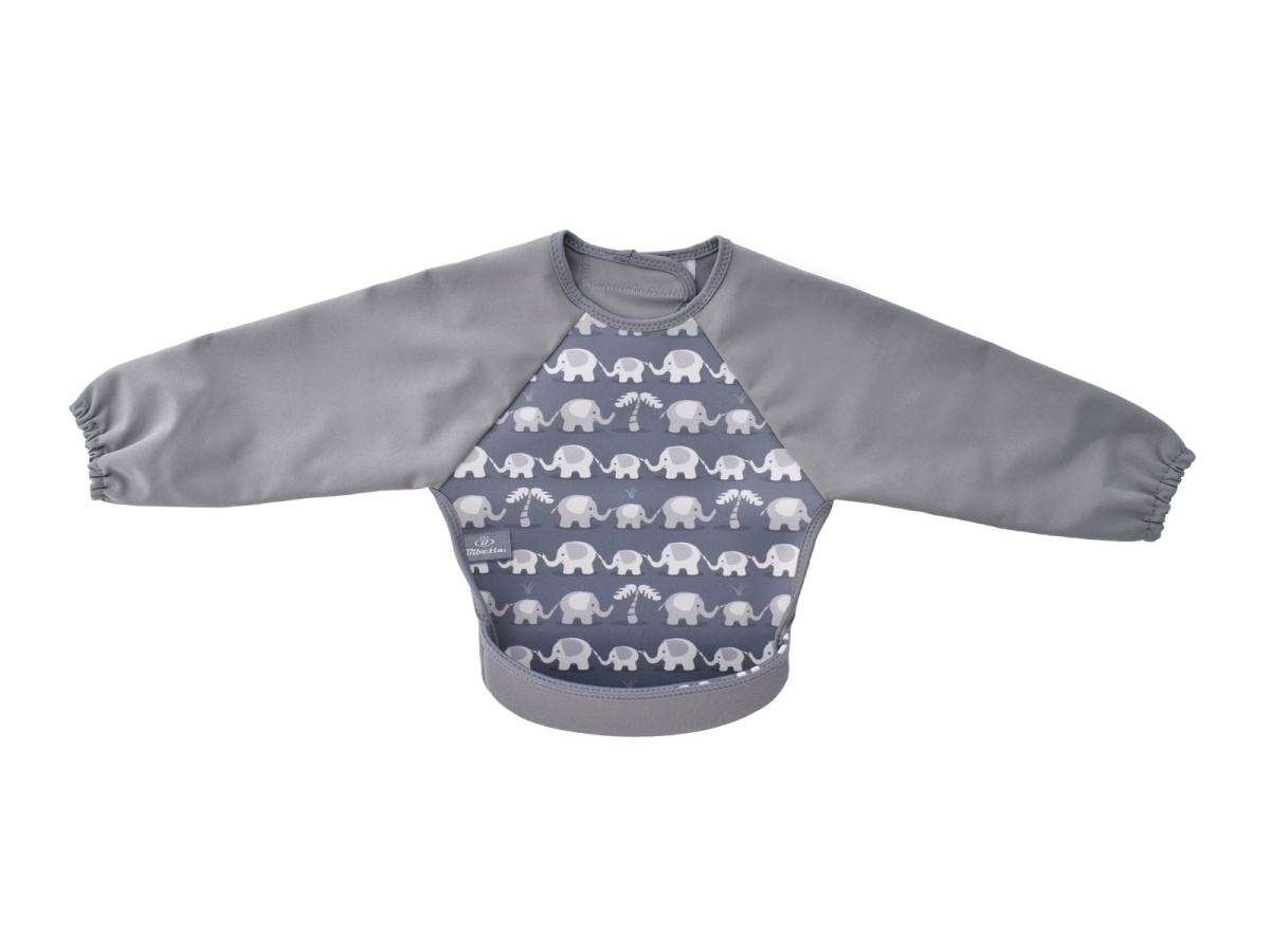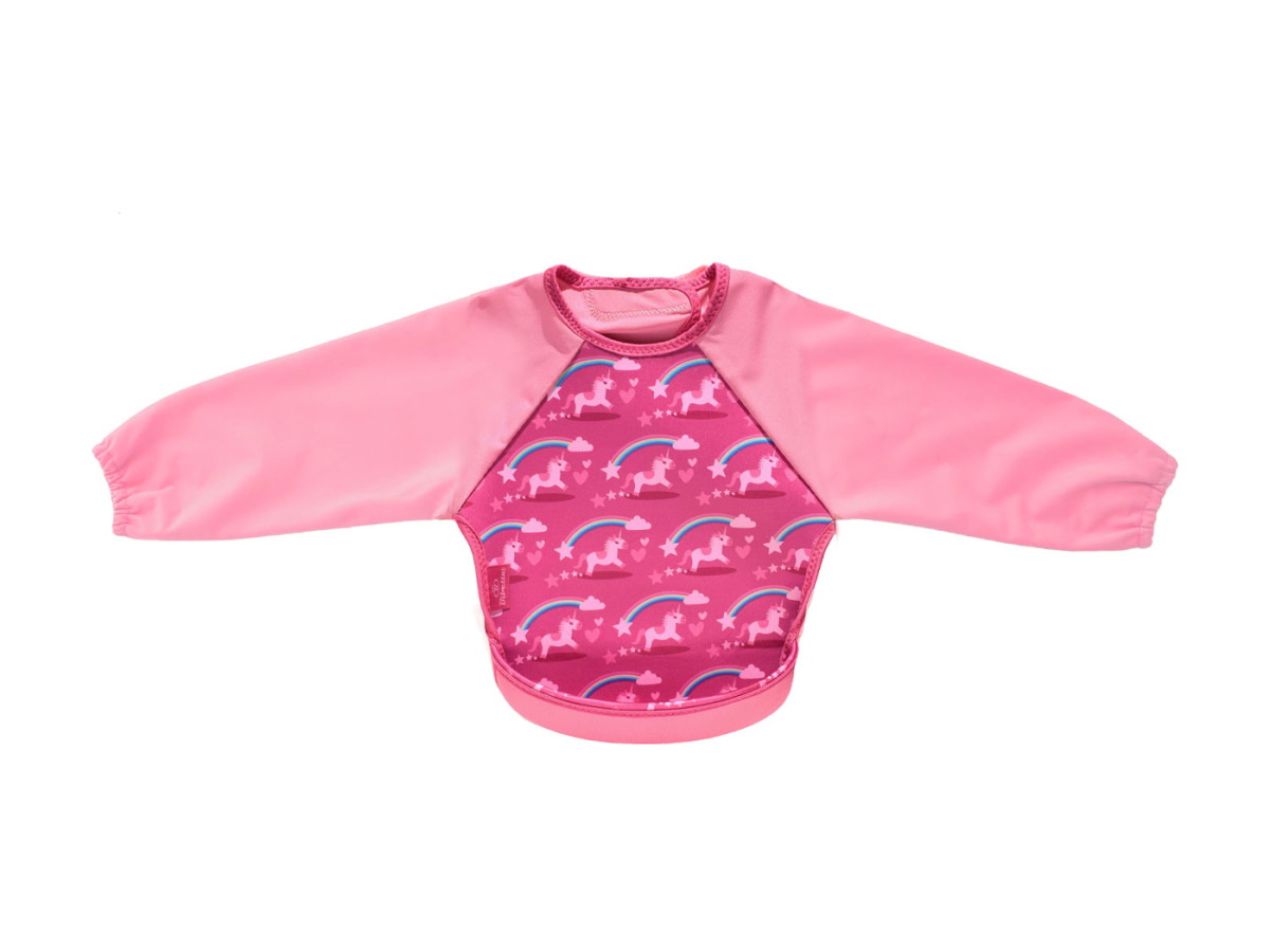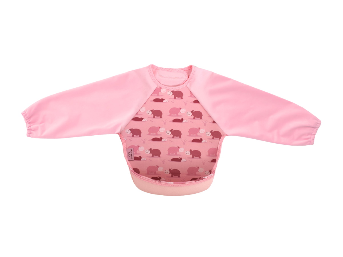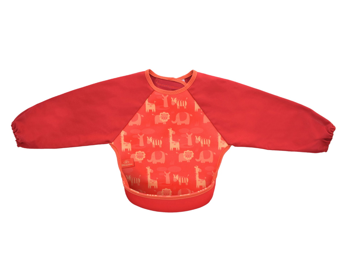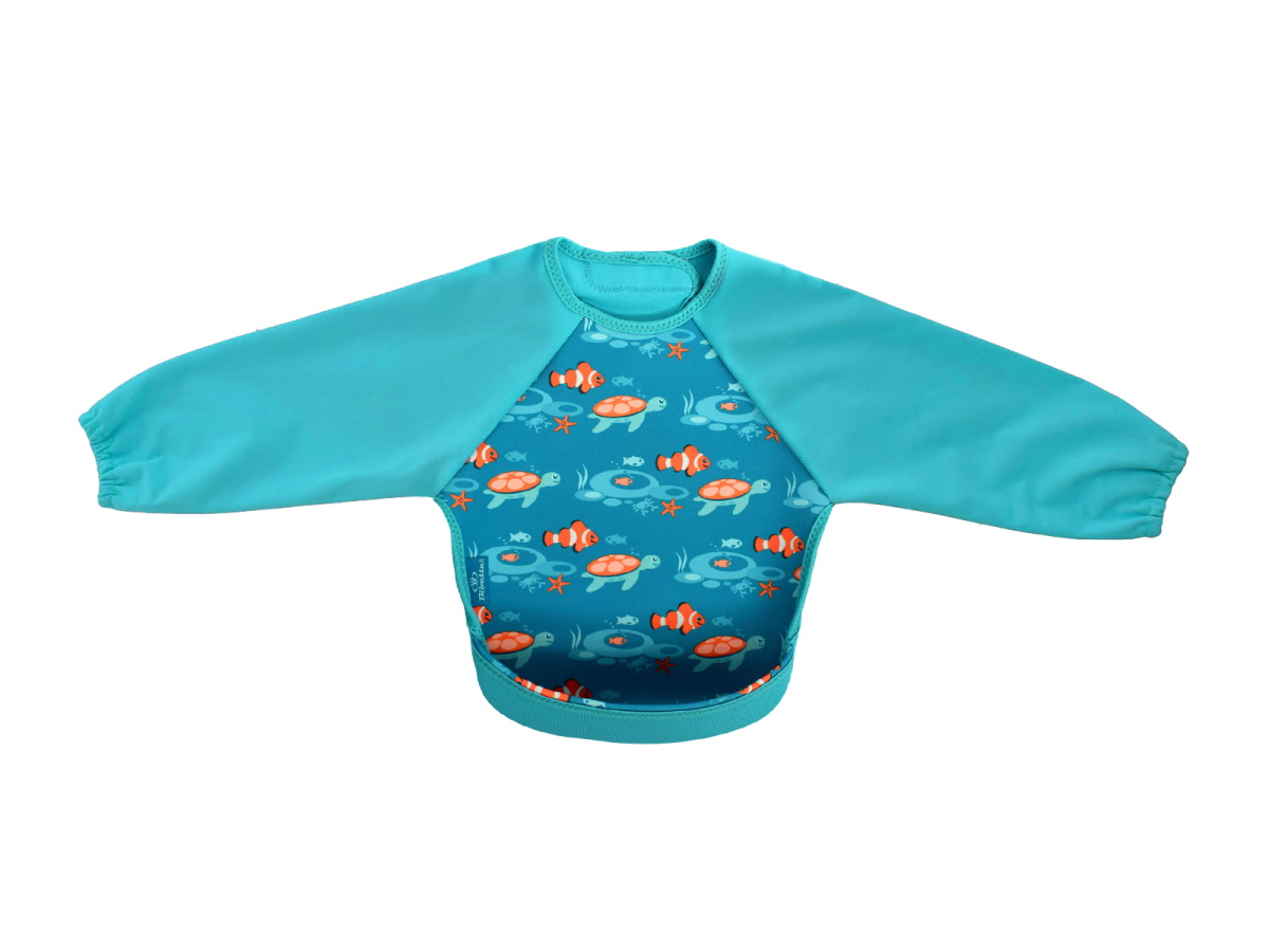 ウェットスーツ素材と防水素材でできた、とっても軽くて軟らかい袖付きのベビー用エプロンです。裾をまくれば、立体的で大きな食べこぼしキャッチ用ポケットが登場!床に落ちる食べこぼしも減るので、お掃除も楽ちん。