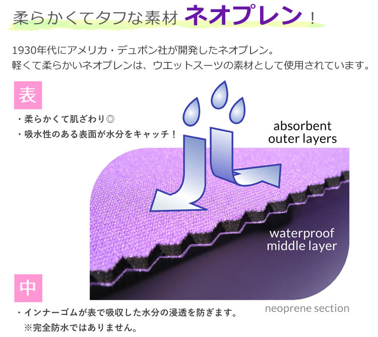 1930年代にアメリカ・デュポン社が開発したネオプレン。軽くて柔らかいネオプレンは、ウエットスーツの素材として使用されています。 『ネオプレン表面』…柔らかくて肌ざわりのよい吸水性のある表面が水分をキャッチします。 『ネオプレン中層』…インナーゴムが表で吸収した水分の浸透を防ぎます。 ※完全防水ではありません。