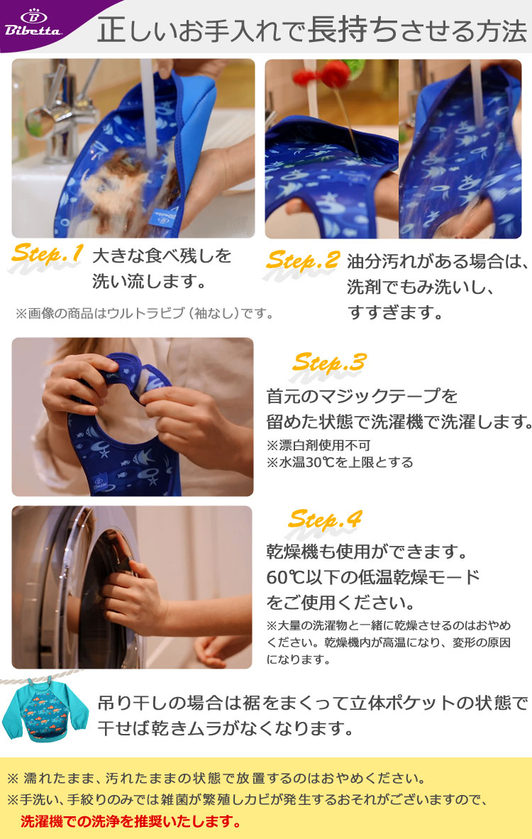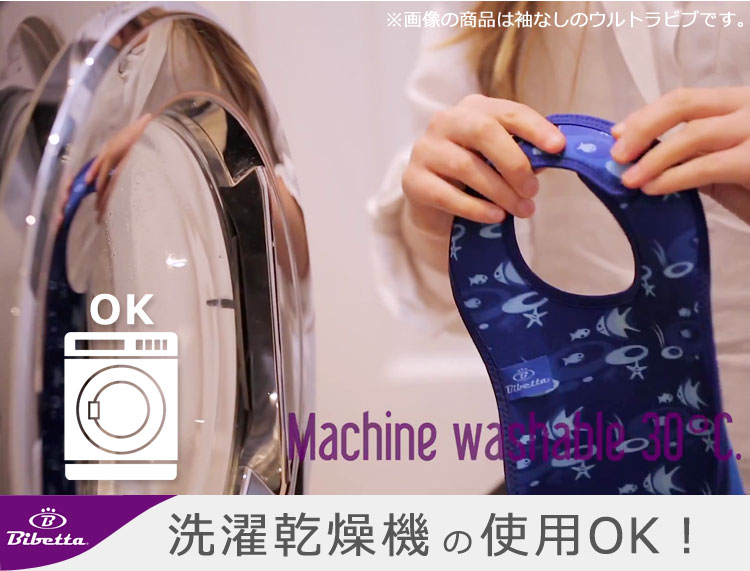 ウルトラビブは洗濯機・乾燥機、両方使えるタフなエプロン(排気温度上限60℃の低温タンブル乾燥のみ)。 洗濯乾燥機が使えることで、家事の時短にもつながり、お子さまとの時間を楽しめます。ママの笑顔でお子さまもにっこり。