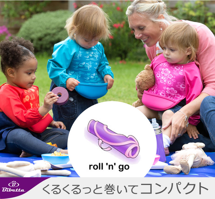 裾をくるっとまくるだけで、立体的な食べこぼしキャッチのポケットに!床に落ちる食べこぼしも減るので、後片付けも楽チンです。