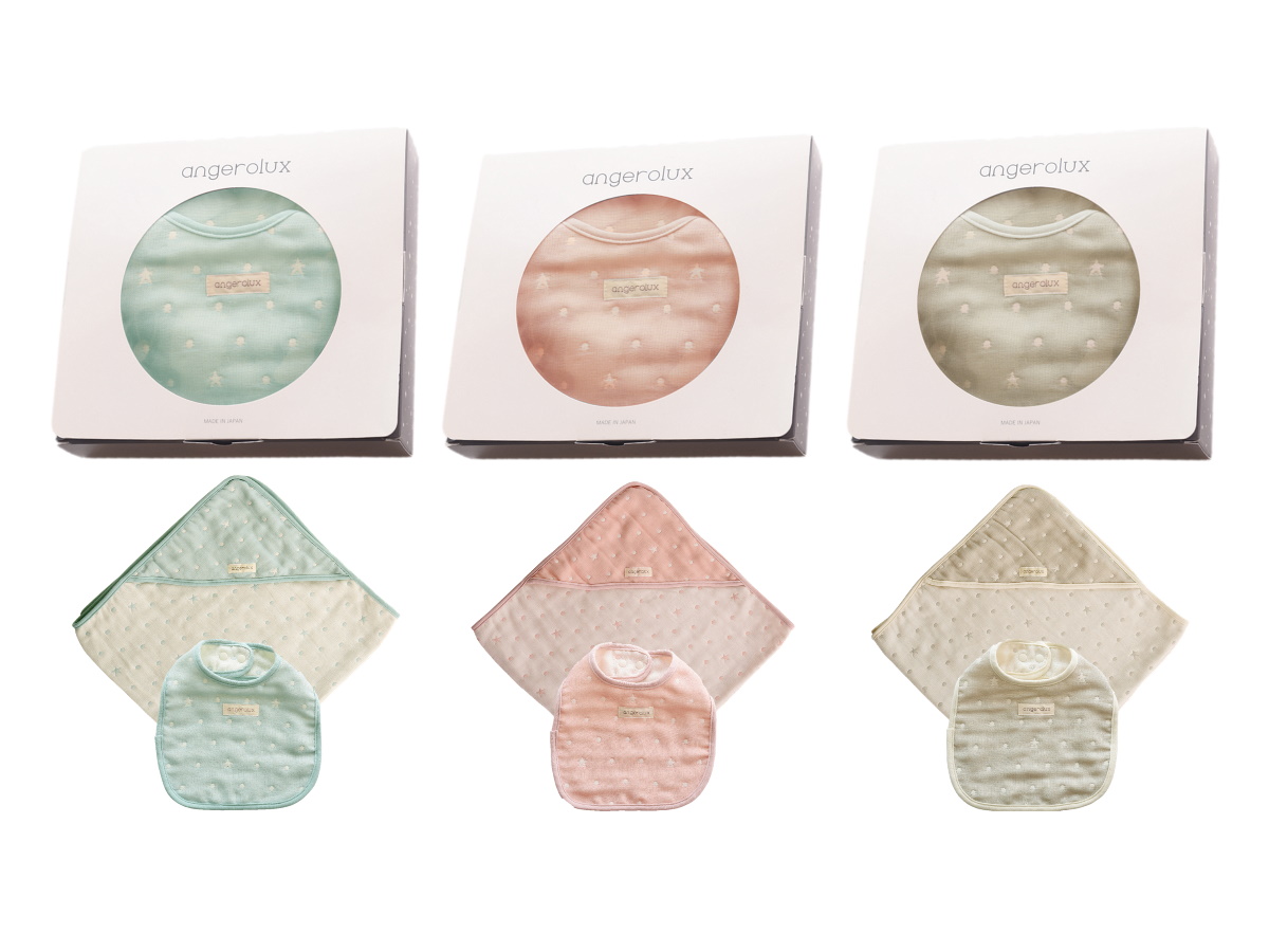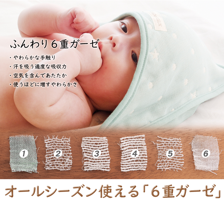 細かい織り目のガーゼと粗い織り目のガーゼを重ねて織り上げた6重ガーゼ生地は、使うほどに空気を含みやわらかさを増します。アンジェロラックスの6重ガーゼは、伝統ある「三河木綿」の製織技術を用いてこれまでの6重ガーゼを超えるふんわりやわらかを実現しました。出産祝いのギフトに。