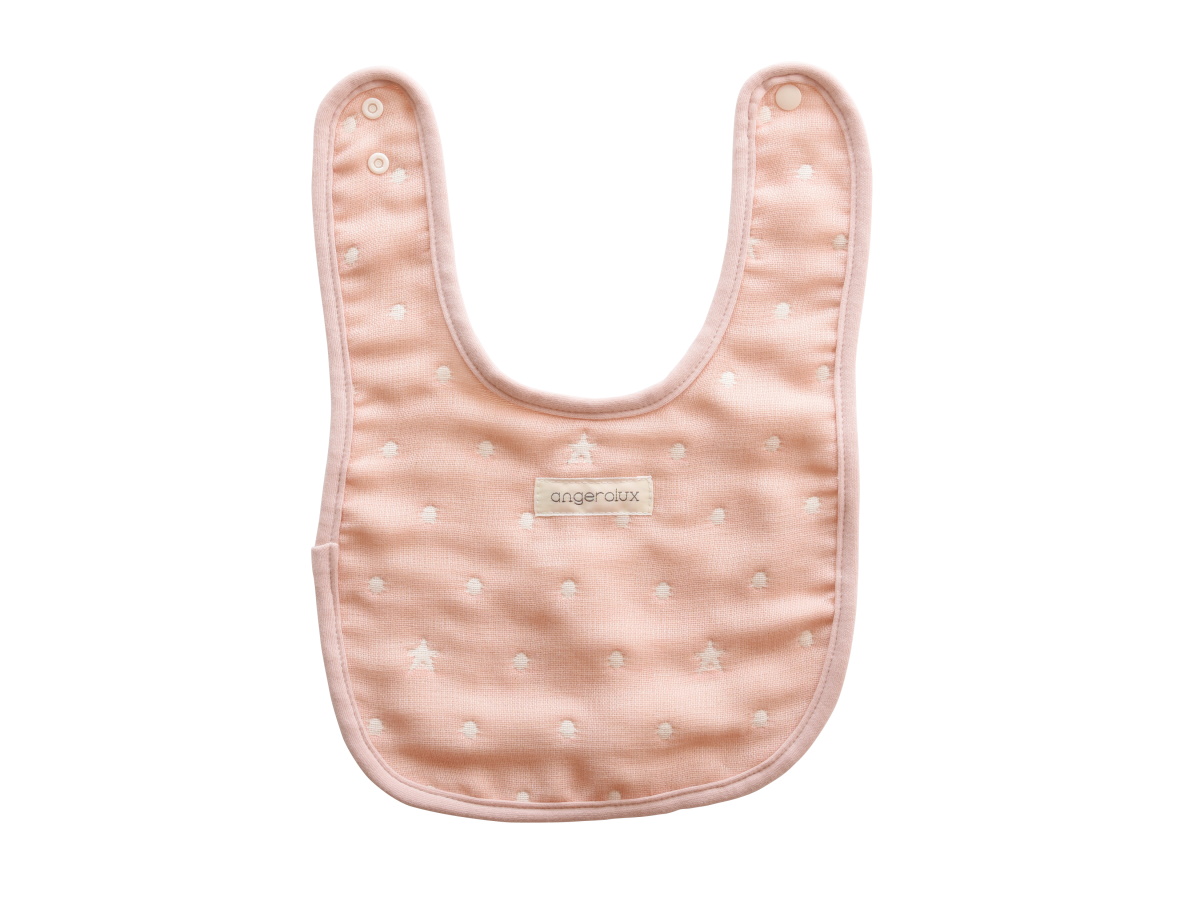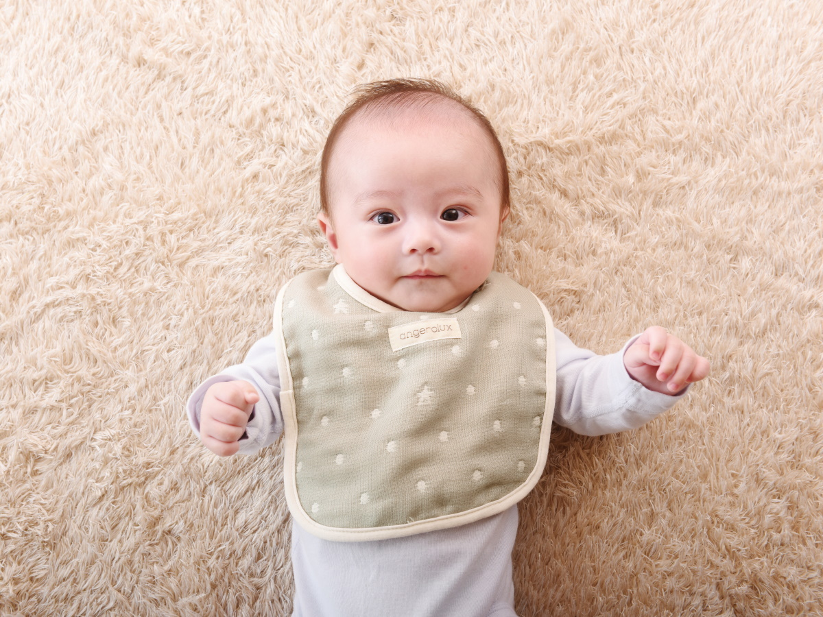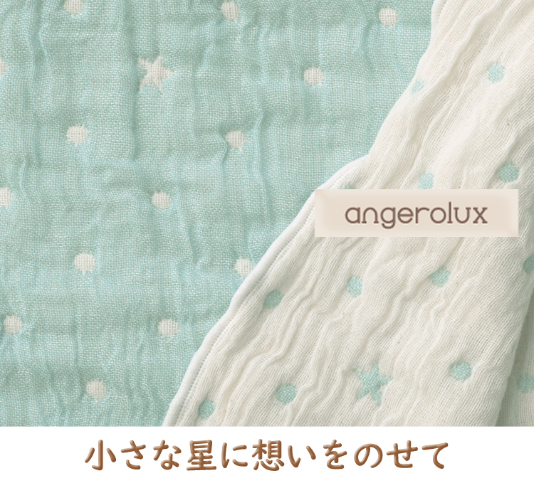 angerolux(アンジェロラックス)は、イタリア語の[angelo(天使)]とラテン語の[lux(光)]、2つの言葉を組み合わせた造語です。『天使のようなこどもたちの未来を照らす光』という意味を持ち、ママやパパと同じ目線でのものづくりを目標にこどもたちの未来のために信頼ある製品を作りたいという想いが込められています。 小さな水玉の中にさりげなくあしらった星は、そんな想いをのせたアンジェロラックスオリジナルのガーゼ生地です。デザインから色選びまで試行錯誤を重ねて完成しました。