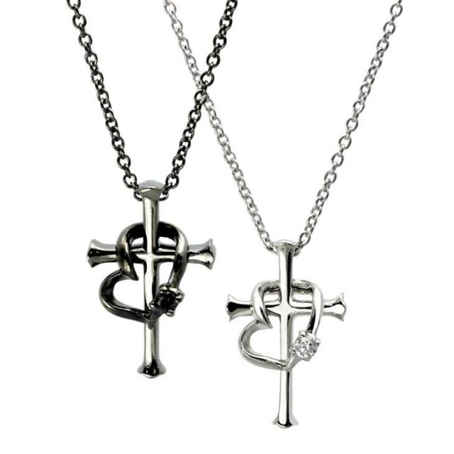 王道人気モチーフのクロスとハートが絶妙なバランスで溶け合った、ペアネックレス。シンプルなクロスにシェイプされたハートが絶妙なバランスでセッティングされたネックレス。ハートにはキュービックジルコニアがセットされ、高級感を醸し出してくれます。 クロスとハートは取り外しが出来るので、気分に合わせて、クロスだけで楽しむこともできます。更に相手のクロスとあわせてブラックのクロスとシルバーのクロスの組み合わせ、ブラックのハートとブラックのハートの組み合わせなど、バリエーション豊富にお楽しみいただけます。 気分やコーディネートに合わせて色々な楽しみ方をしたいカップルにおすすめです。