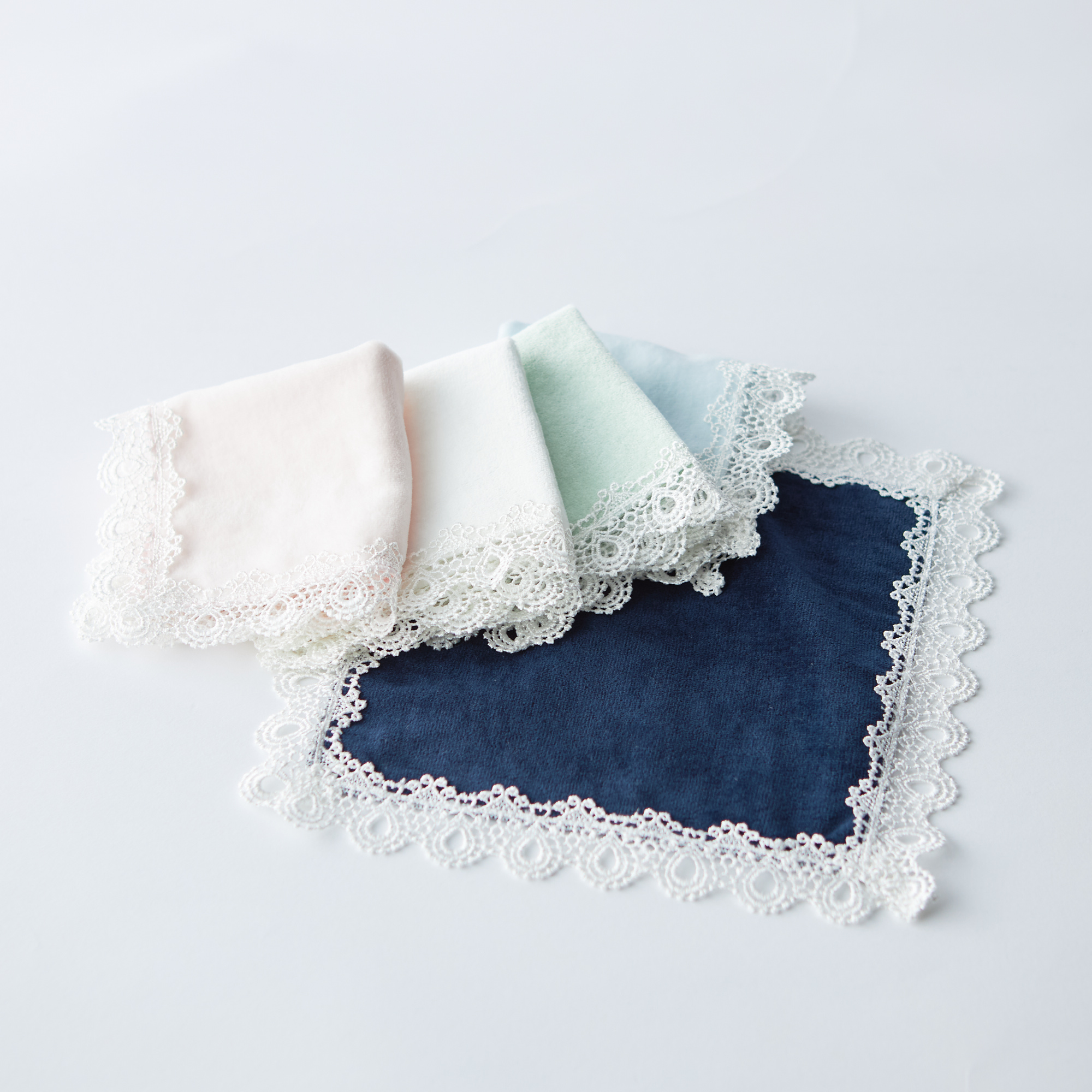 実用的で美しいハンカチをコンセプトに作られ、日本有数のタオル産地 今治産のタオル地を使用し、ふっくらとした肌触りが特徴的なタオルハンカチです。 表面にはパイルループをカットしたシャーリング加工を施し、ベルベットのような質感で高級感を演出しています。 タオルの周りに贅沢にあしらったレースが最大の魅力です。