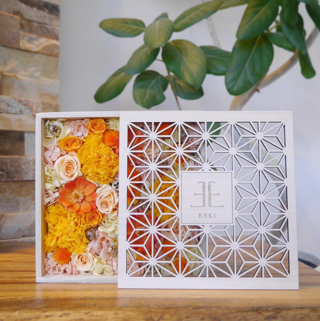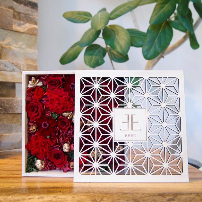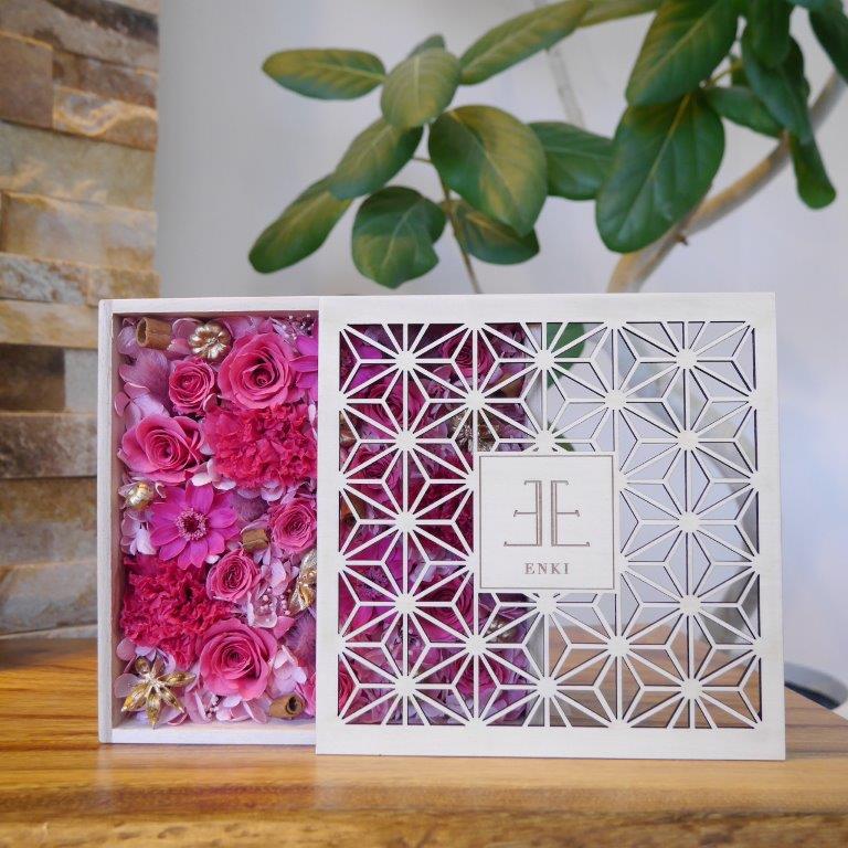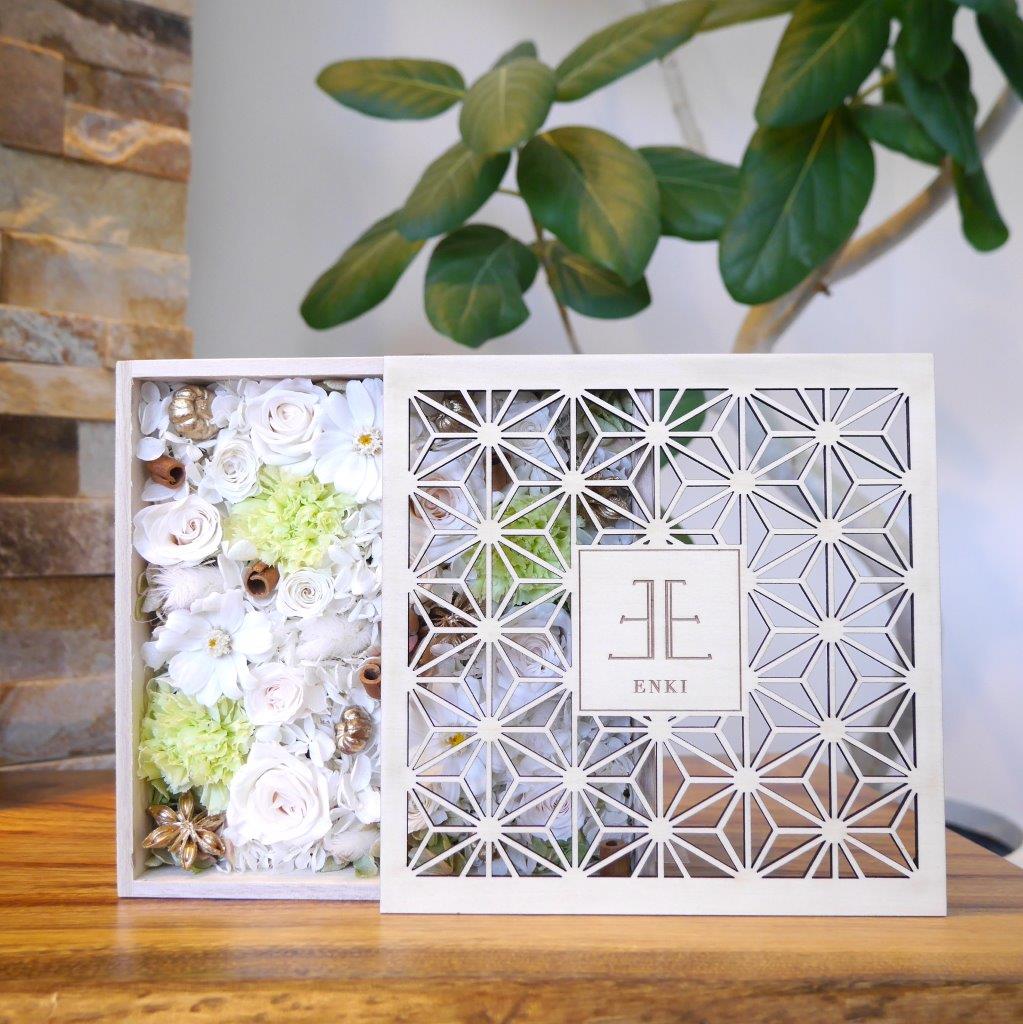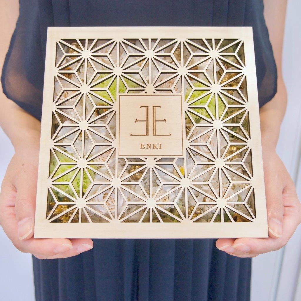 『想いを伝える』をコンセプトに、花言葉やお花の色、箱のデザインにも想いを込めた「atelier Enki(アトリエ エンキ)」オリジナル商品。蓋に彫られた麻の葉文様は、魔除けや縁起がよい模様とされています。その集合体の麻の葉は強い意味と美しさを兼ね備えたデザインです。