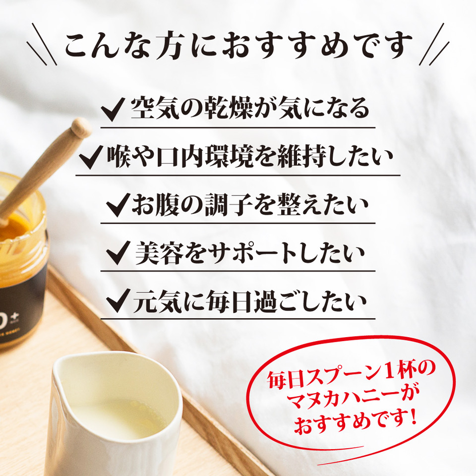 朝の通学・出勤前にスプーン1杯のマヌカハニー。 夜の就寝前にスプーン1杯のマヌカハニー。歯磨き後でも問題なしです。 こんな方におすすめ! ・空気の乾燥が気になる ・喉や口内環境を維持したい ・お腹の調子を整えたい ・美容をサポートしたい ・元気に毎日過ごしたい