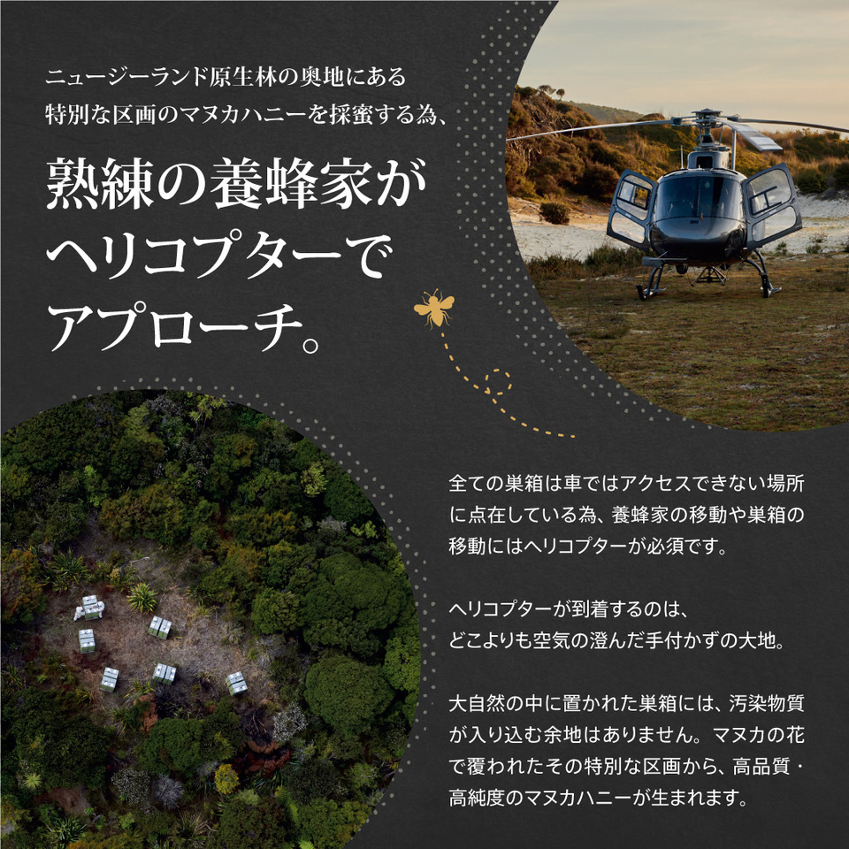 “ヘリコプターでしか採取できないほどの希少性” を持ったマヌカハニーです。トゥルーハニーはニュージーランドの最果て奥地で生まれます。そこにある巣箱には車などでたどり着くことはできません。大自然の秘境には汚染物質など入り込む余地はなく『高品質・高純度のはちみつ』が出来上がるのです。