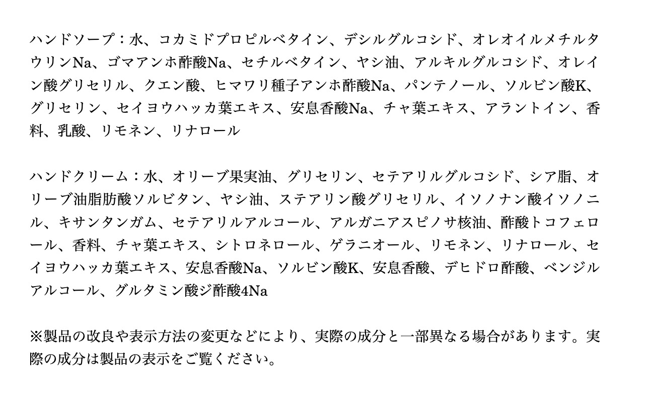 | 商品本体重量(容積) | ハンドソープ:570g(500ml) ハンドクリーム:100g(100ml) |