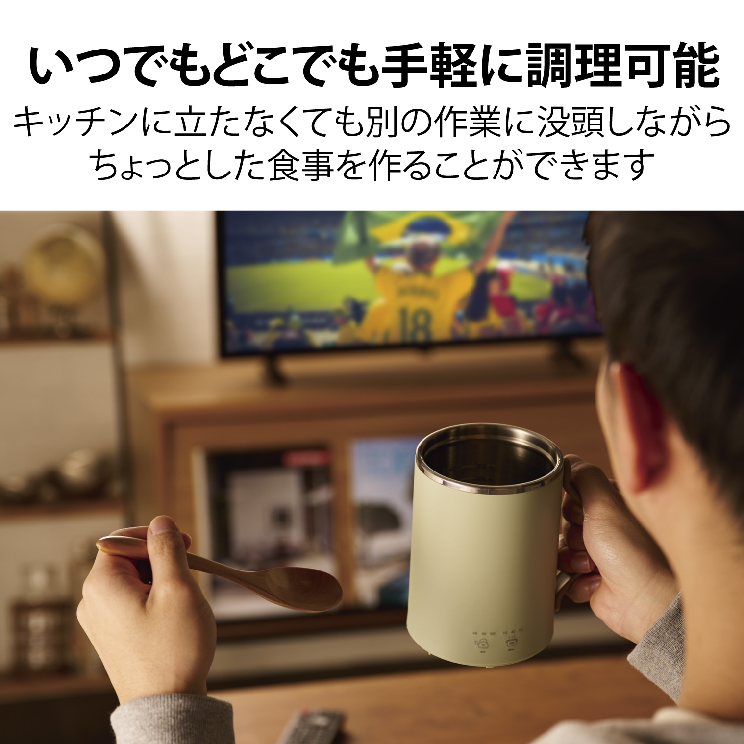 大口注文・法人のお問い合わせはこちら材料を入れてスイッチを押すだけで、ほかほかのスープや味噌汁を手軽に作れるマグカップ型電気なべです。デスクに置いても邪魔にならないコンパクトサイズなので、1杯分(350ml)だけお湯を沸かしたり飲み物を淹れたりするのにも最適です。カラーバリエーションは、オフィスにもインテリアにも馴染みやすい落ち着いたカラーで、ピンク、ミント、ホワイトの3種類から選べます。