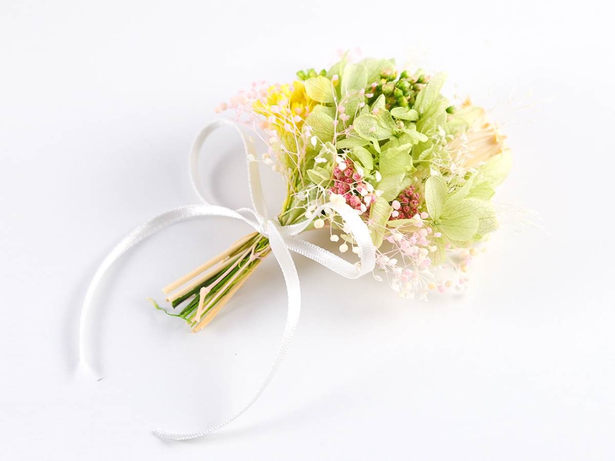 大口注文・法人のお問い合わせはこちら普段言葉にできない想いを花言葉と本物のお花で伝えられるミニブーケ。ドライフラワーやプリザーブドフラワーを使用しているので、長期間美しい花を楽しむことができます。ホワイトカラーのリボンがアクセントになっています。 贈るシーンや相手に伝えたい想いに合った花言葉のブーケを選べば、日頃の感謝や溢れる想い、長年伝えられなかった想いなどを伝えることができます。とっても可愛いミニサイズなので、ちょっとしたお礼やお花を添えたい時にちょうどいいサイズ感です。お花に想いを込めてみませんか。