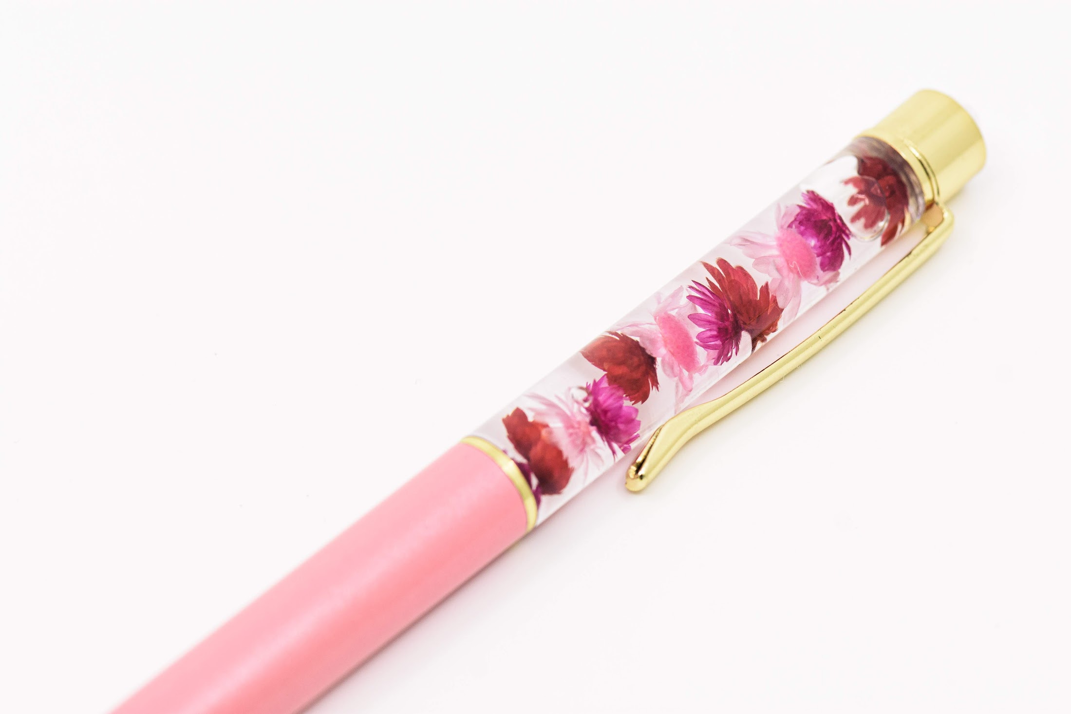 柔らかい色合いのピンクは、可愛いイメージの女性におすすめ。 本体は、重厚感のあるしっかりした作りになっており、書き心地もGOOD。実用性と可愛さが加わって、プレゼントにもぴったりです。 ●ボールペン芯:黒1mm(芯は回して出す回転式です) ●すべて1本1本ハンドメイドまた天然素材を使用しているため、個体差がございます。予めご了承ください。
