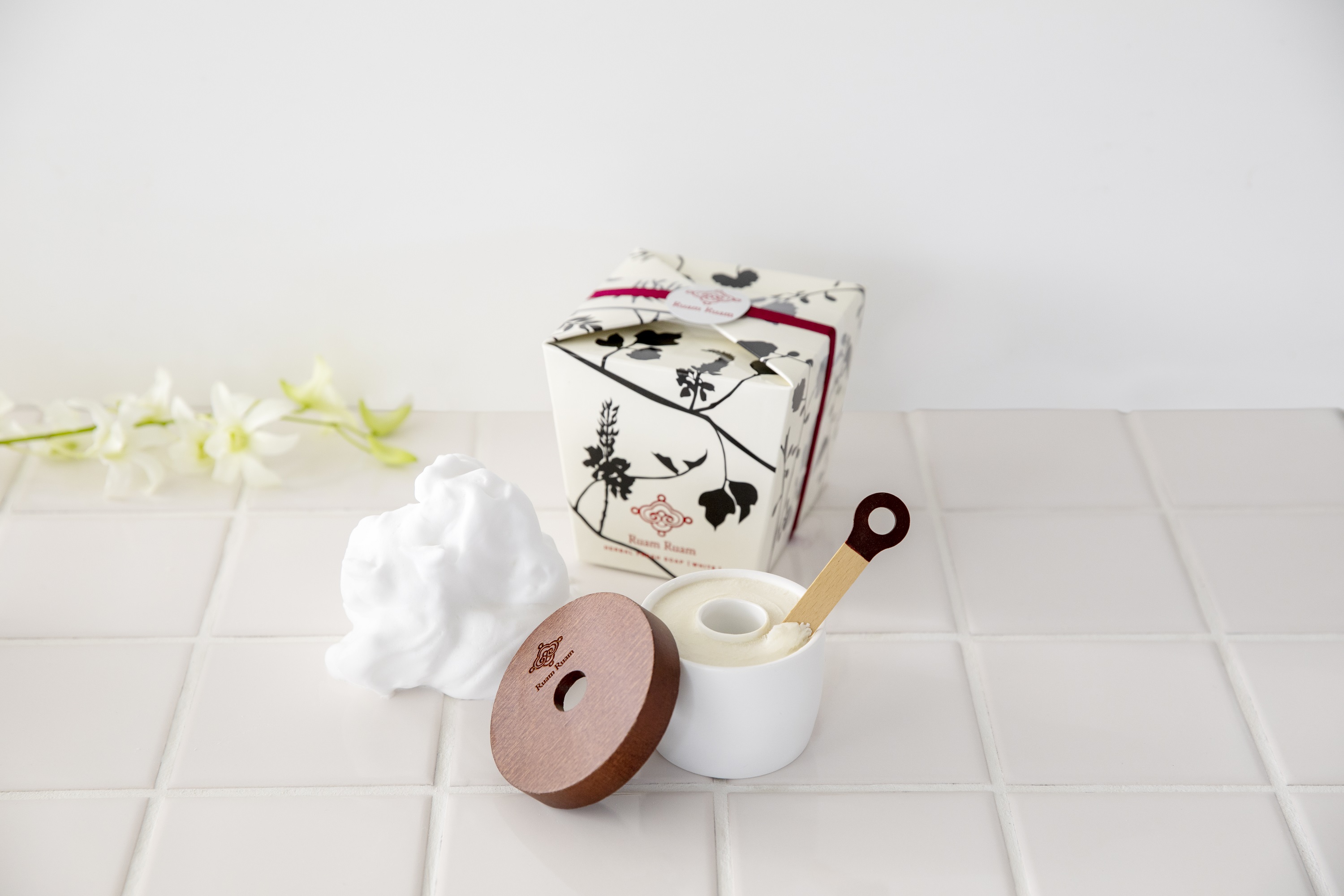 力強い自然素材にアジアの知恵と繊細さを重ね合わせることで生まれた日本のブランド「Ruam Ruam(ルアンルアン)」の陶器に入った生せっけんです。タイ伝統のハーブレシピを基に美肌に効果的なハーブを厳選し、繊細な日本人女性の肌に合わせて作った生せっけんは、美容液成分56%と2種類のクレイを配合し、ソフトクリームのような濃密泡で毛穴の黒ずみや皮脂汚れまでしっかりと落しながら、しっとりした洗い上がりを実現します。