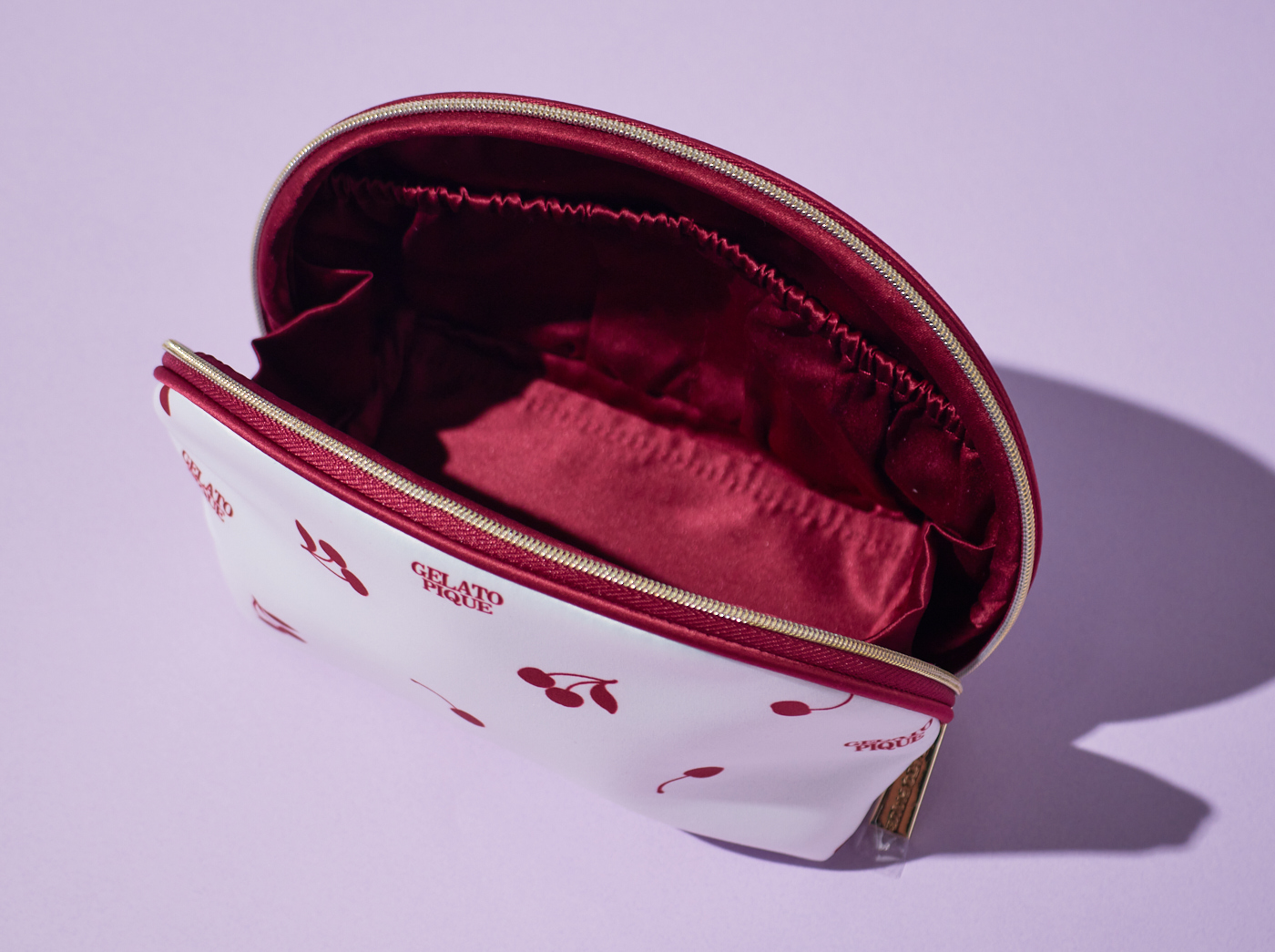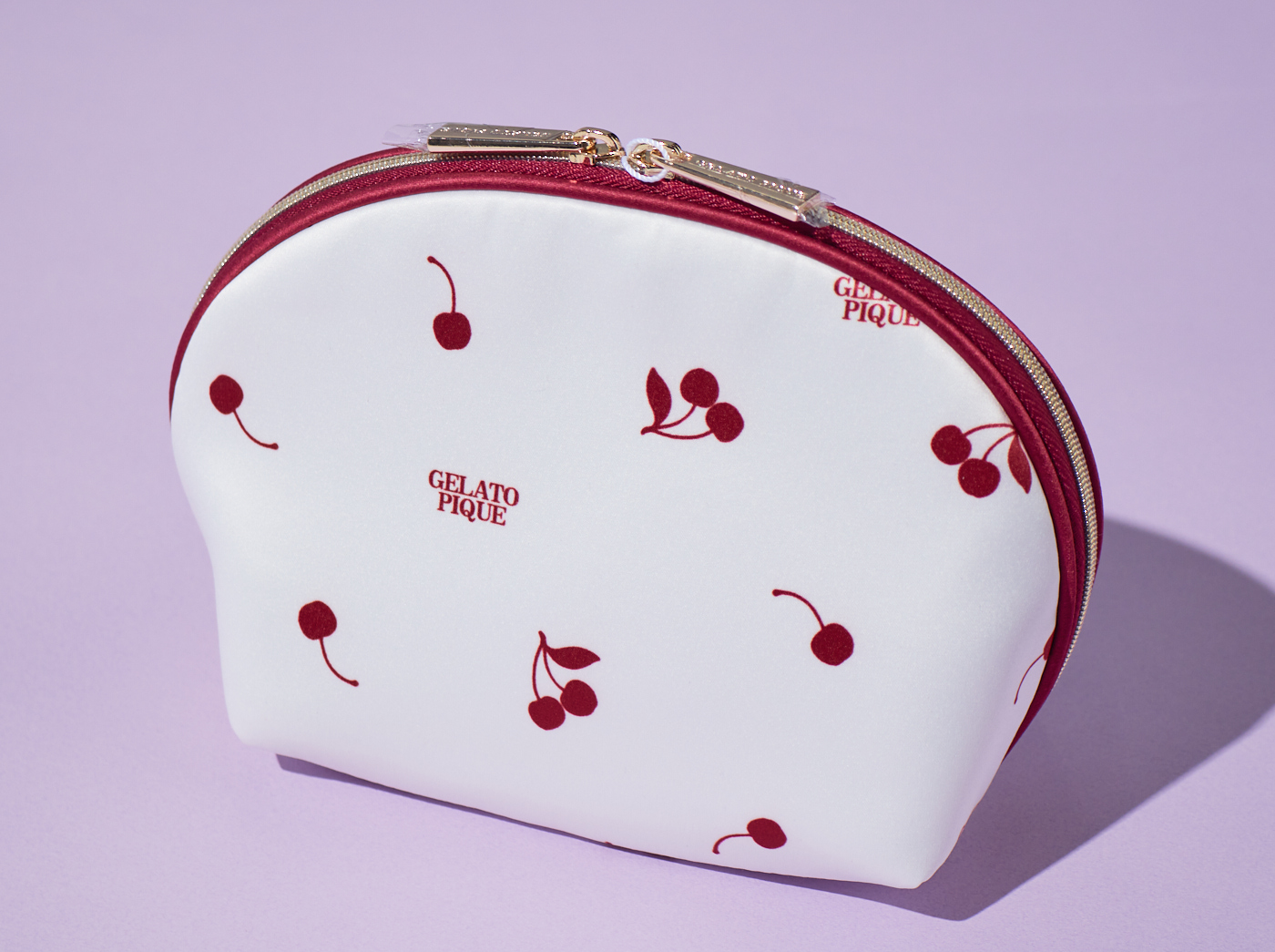 レトロクールなチェリー柄にときめくマチ付き収納ポーチ。シンプルなホワイト地に赤いチェリー柄とトリミングのデザインを施しました。