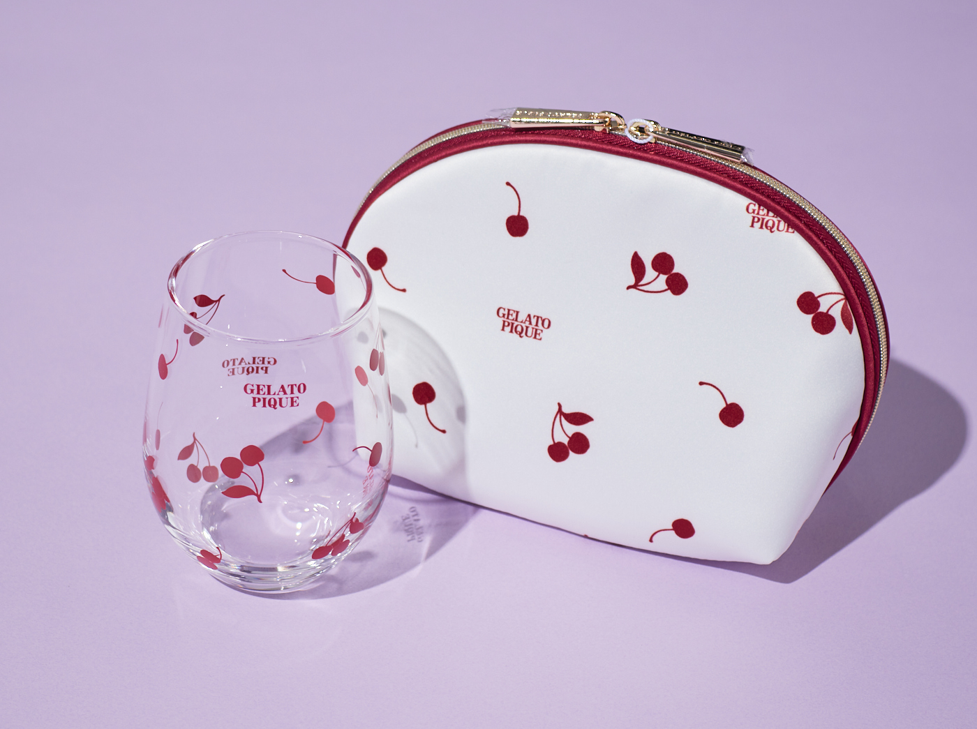 キュートなアメリカンチェリー柄デザインのポーチとグラスセット。ご友人やお世話になっている方への贈り物にはもちろん、ご自分へのご褒美にもぜひご利用ください。