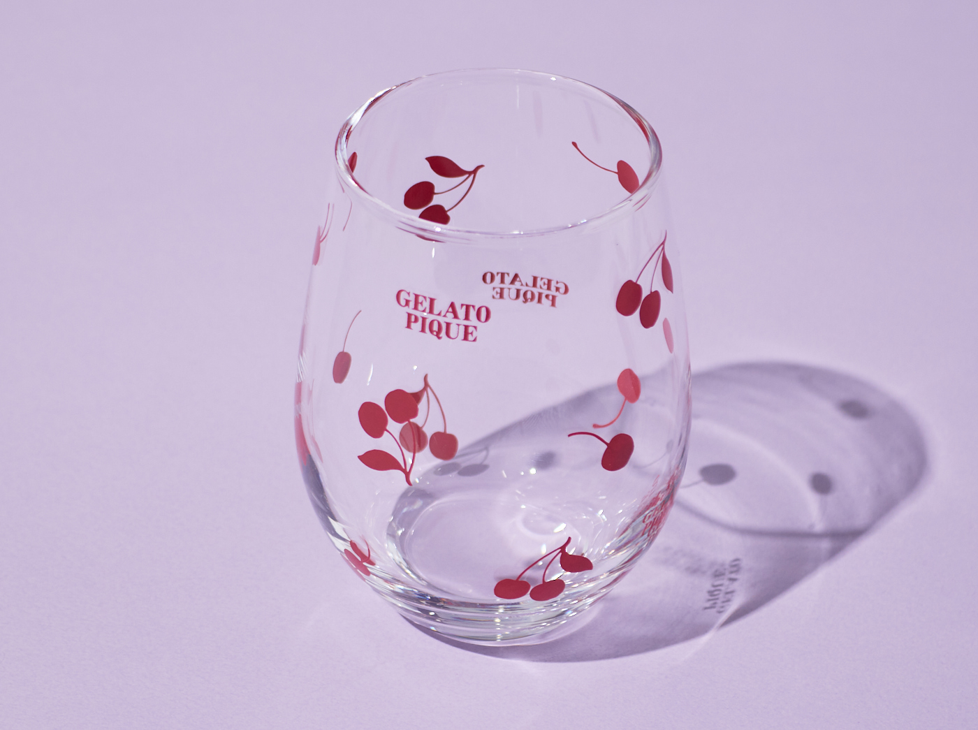 チェリー柄のグラスは、手にしっくりなじむコロンとしたフォルムがポイント。たっぷり入るので、暑い日に氷を入れた冷たいドリンクを楽しむにも最適です。