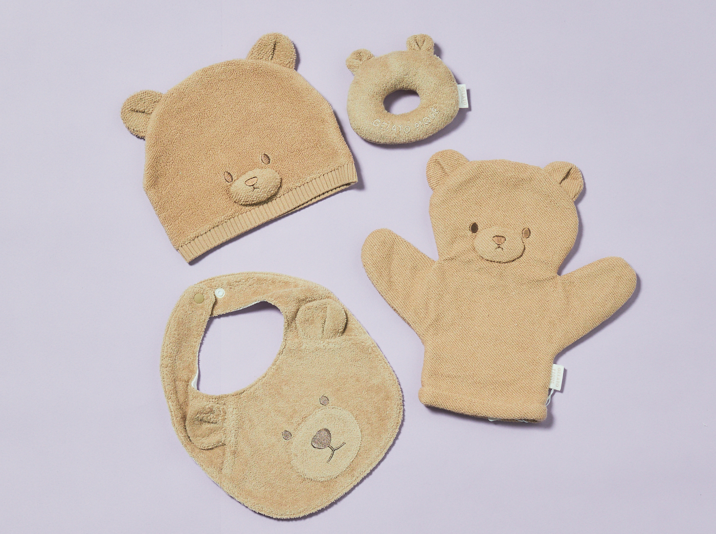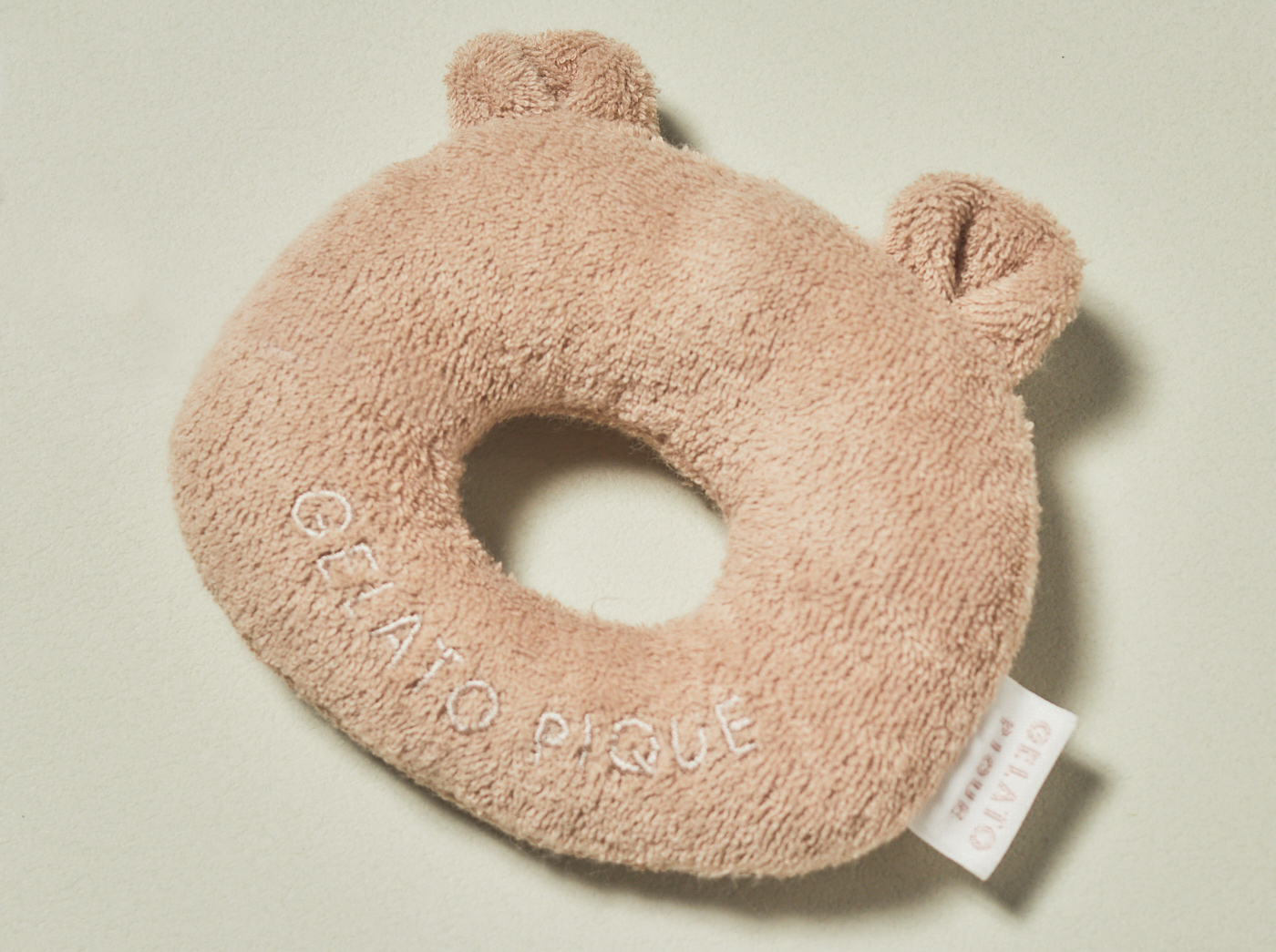 赤ちゃんの繊細なお肌にふさわしい、柔らかなパイル素材を使ったベビーアイテムのシリーズです。小さな手でも握りやすいリング形状のラトルは、ベア耳をあしらったデザインがポイント。