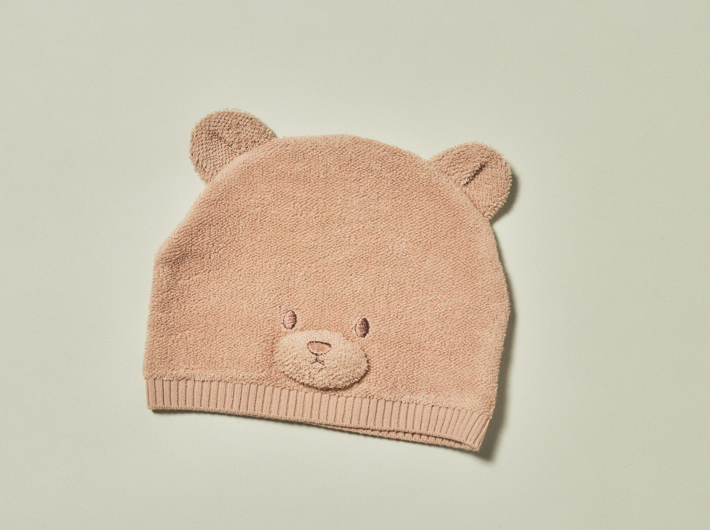 赤ちゃんの繊細なお肌にふさわしい、コットン100%のタオルのようなふんわりニットで作ったベビーアイテムのシリーズです。ベアのお顔をモチーフにしたキャップは、まるいお耳のデザインに胸キュン。紫外線や冷房の冷えなどから大切な頭部を守ります。