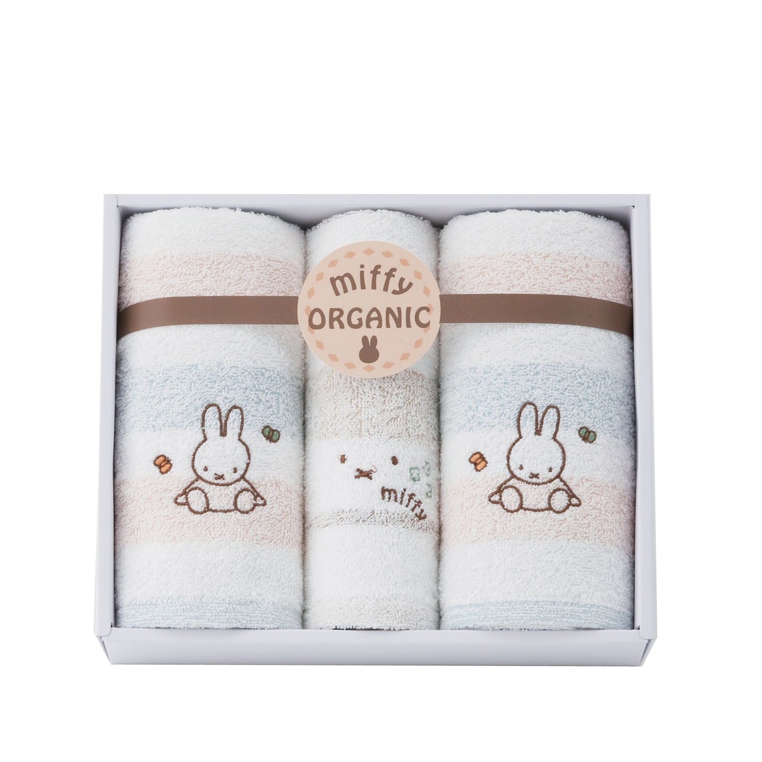 大口注文・法人のお問い合わせはこちらオーガニックコットンを使用したミッフィーのタオルギフトです。シンプルなボーダーにミッフィーの刺繍がアクセントになったデザイン。フェイスタオル2枚、ウォッシュタオル1枚がセットになっています。