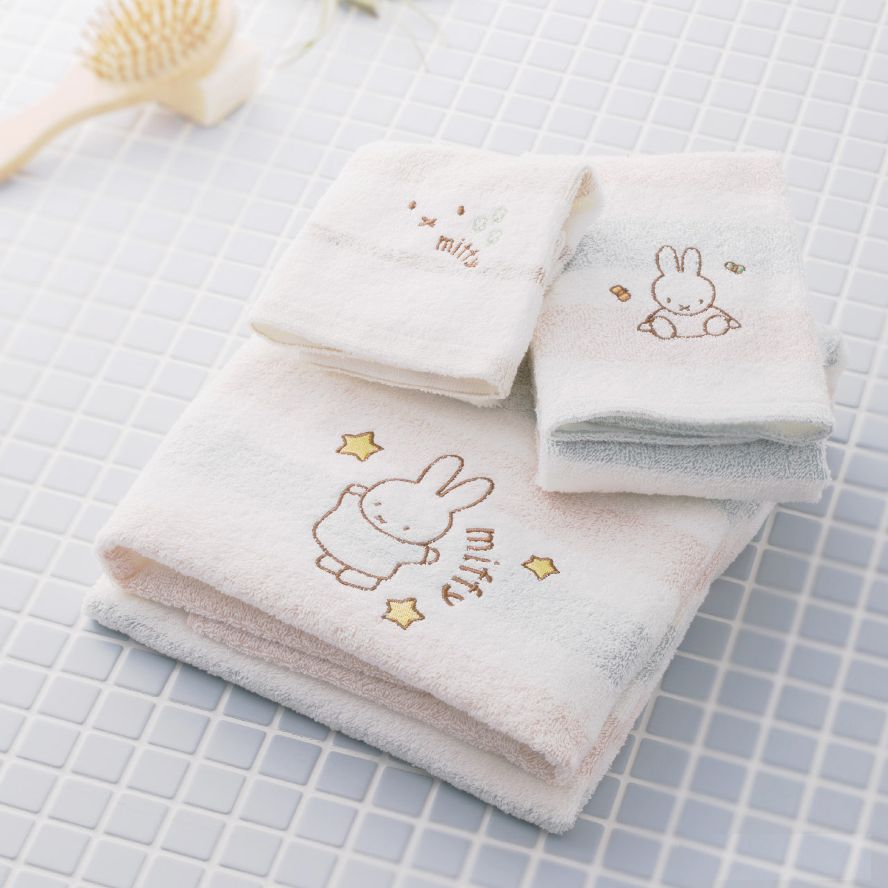 シンプルなボーダーにミッフィーの刺繍がアクセントになった可愛らしいデザインのタオルギフトです。お世話になった方への贈り物にぜひご利用ください。