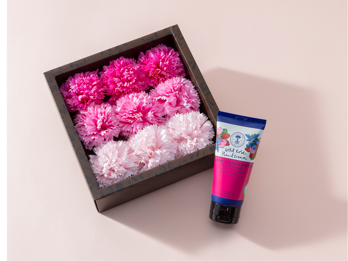 ボックスいっぱいに敷き詰められた、色鮮やかなカーネションのバスフレグランス「花のカタチの入浴剤」とイギリス生まれのヘルス&ビューティブランド「NEAL'S YARD REMEDIES(ニールズヤード レメディーズ)」のワイルドローズハンドクリームのタンプ限定セットです。
