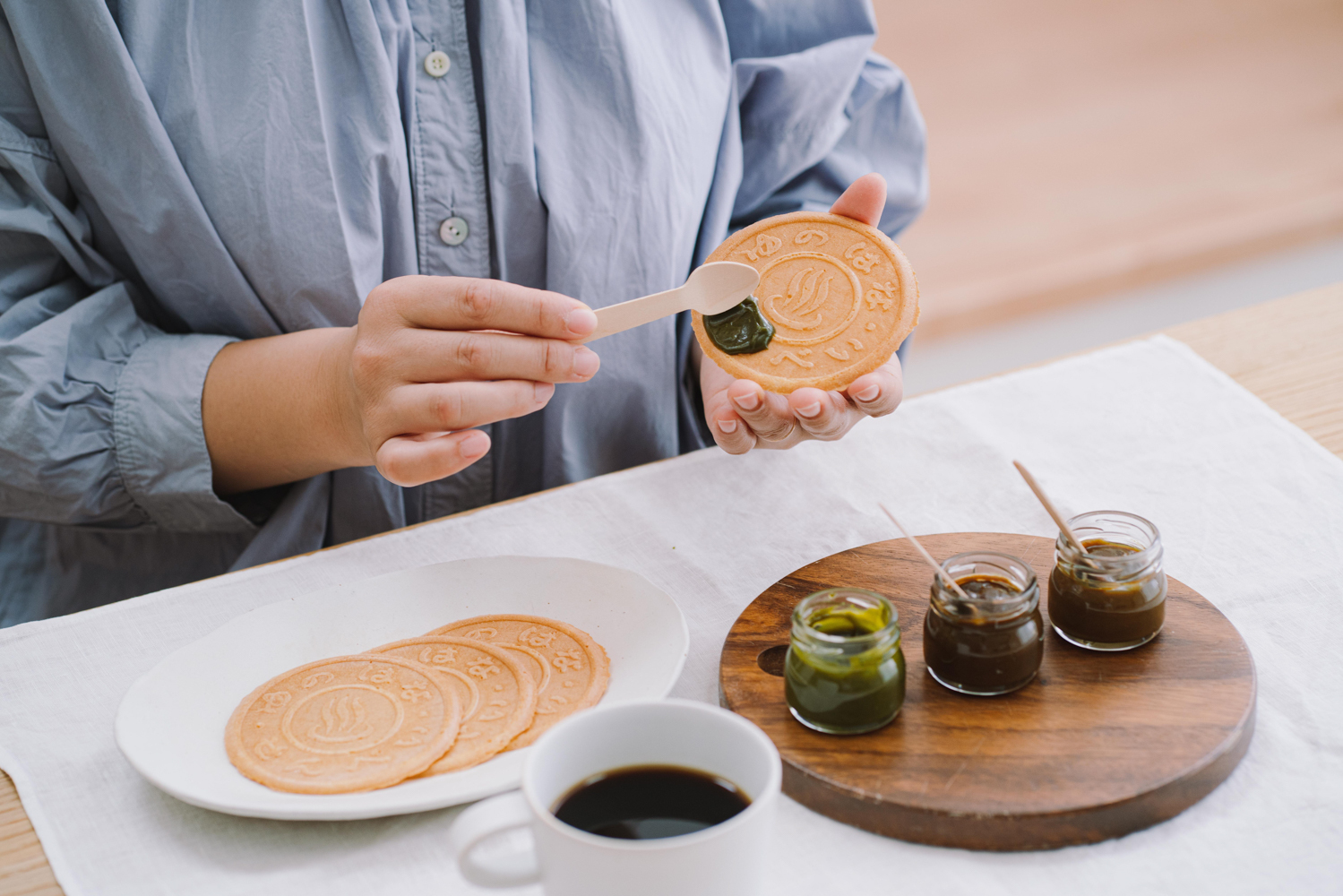 湯の花せんべいに付けるだけでなく、サンドしたり、ディップしたり、お好みの食べ方でお楽しみください。餡ペースト(コンフィチュール)はせんべいはもちろんパンに付けたり、ミルクと混ぜてラテにしてみたりと、他の食べ方もできます。