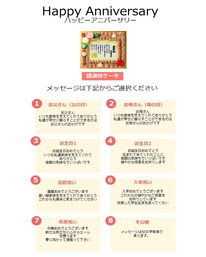大口注文・法人のお問い合わせはこちらお誕生日やイベント、記念日のサプライズギフトなどにぴったりの賞状ケーキです。メッセージやサイズを贈る方に合わせてお選びいただけます。