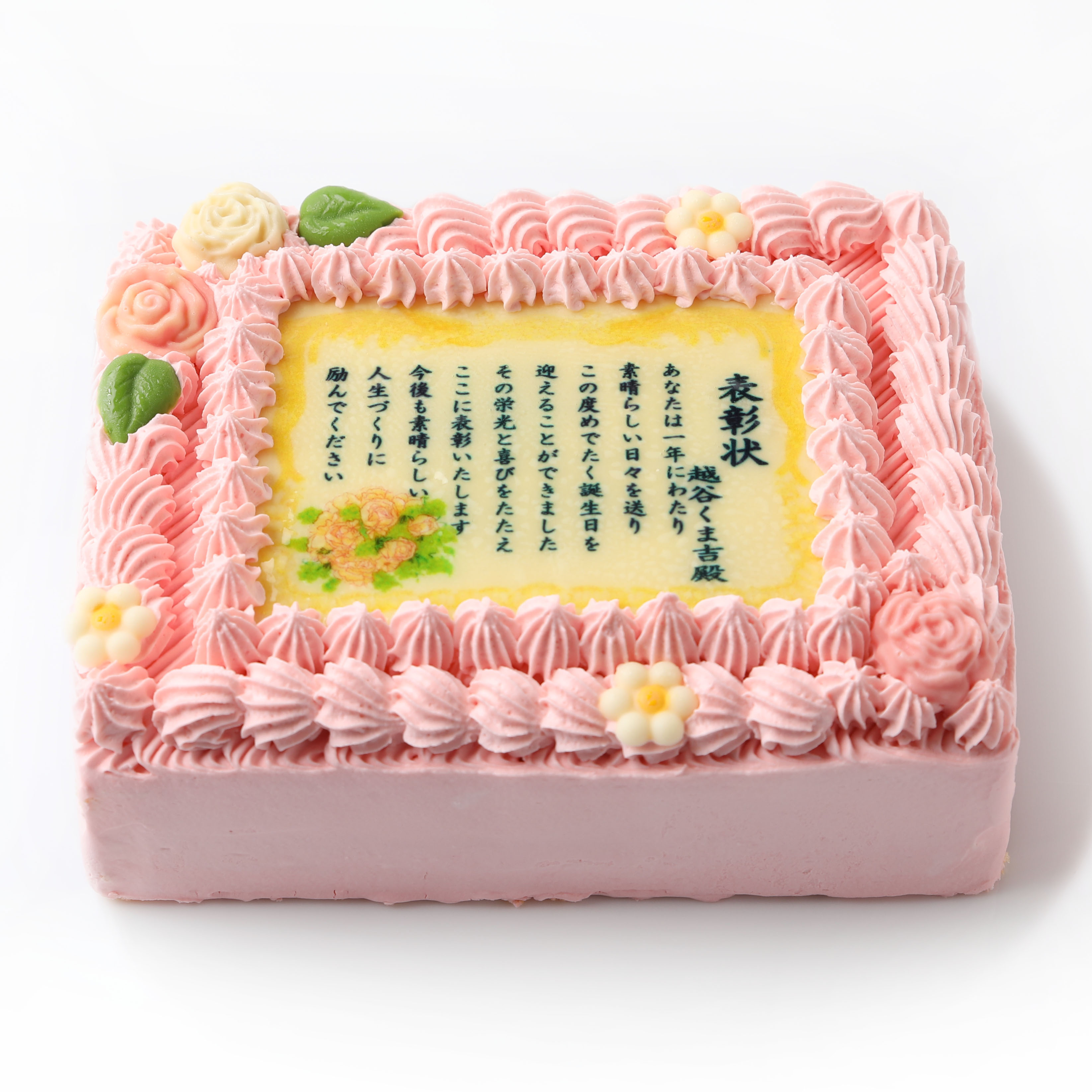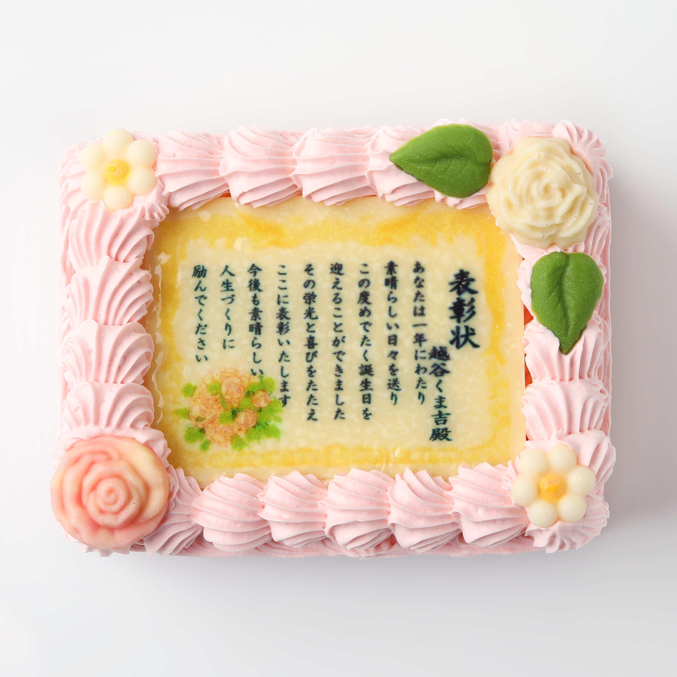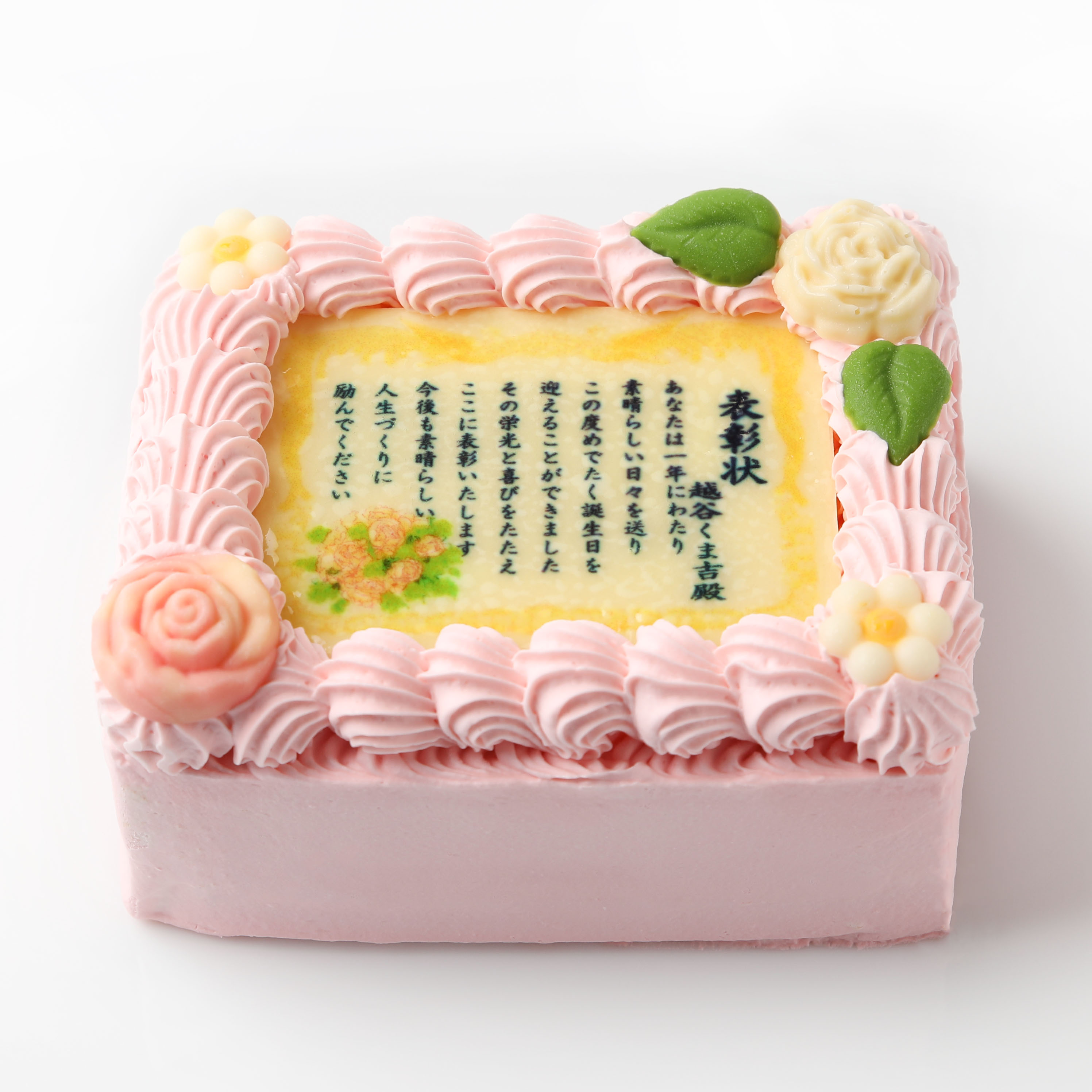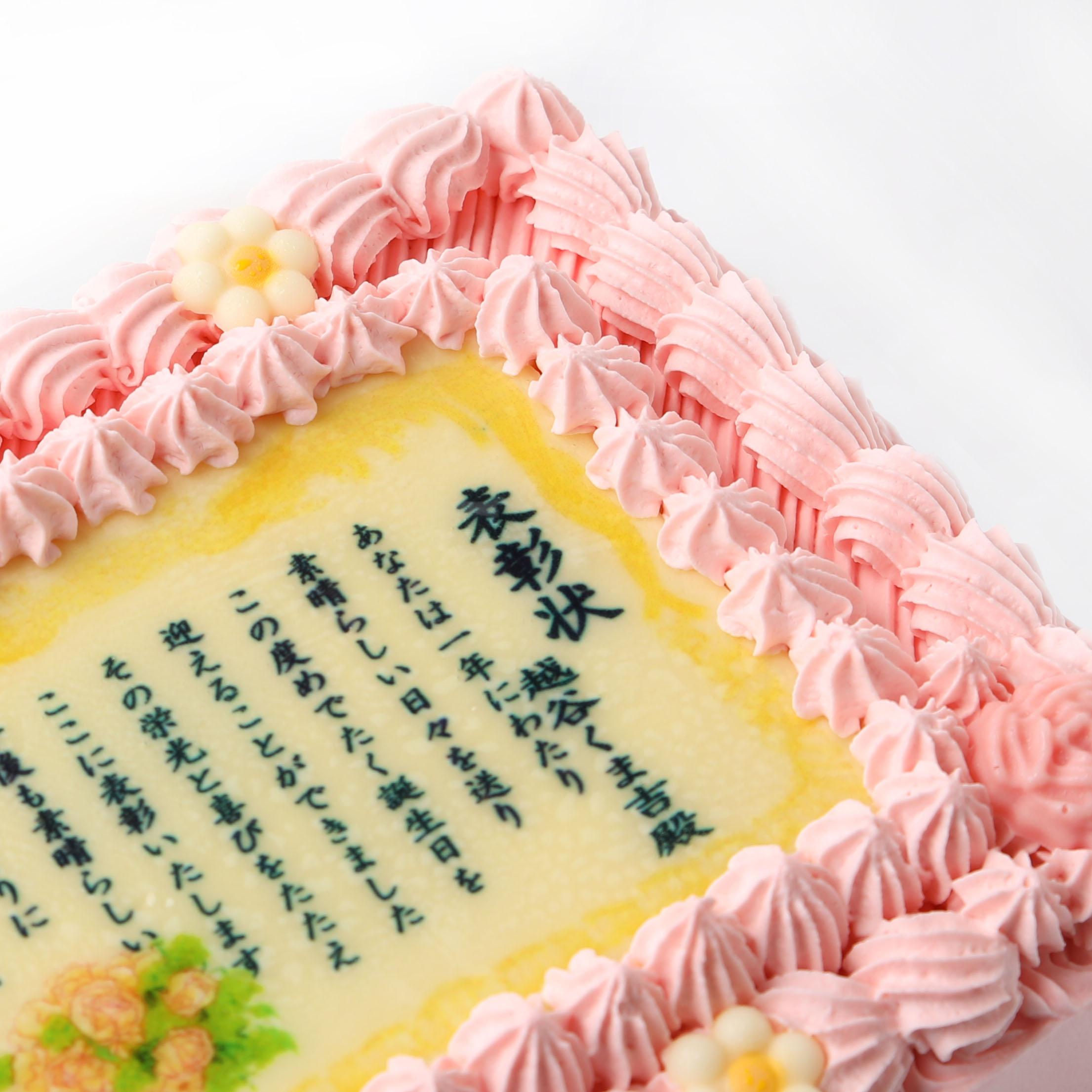 華やかな印象のピンクカラーの表彰状ケーキ。伝えたい思いをケーキで届ければ、きっと喜んでいただけるはず!大切な方への贈り物にぜひご利用ください。
