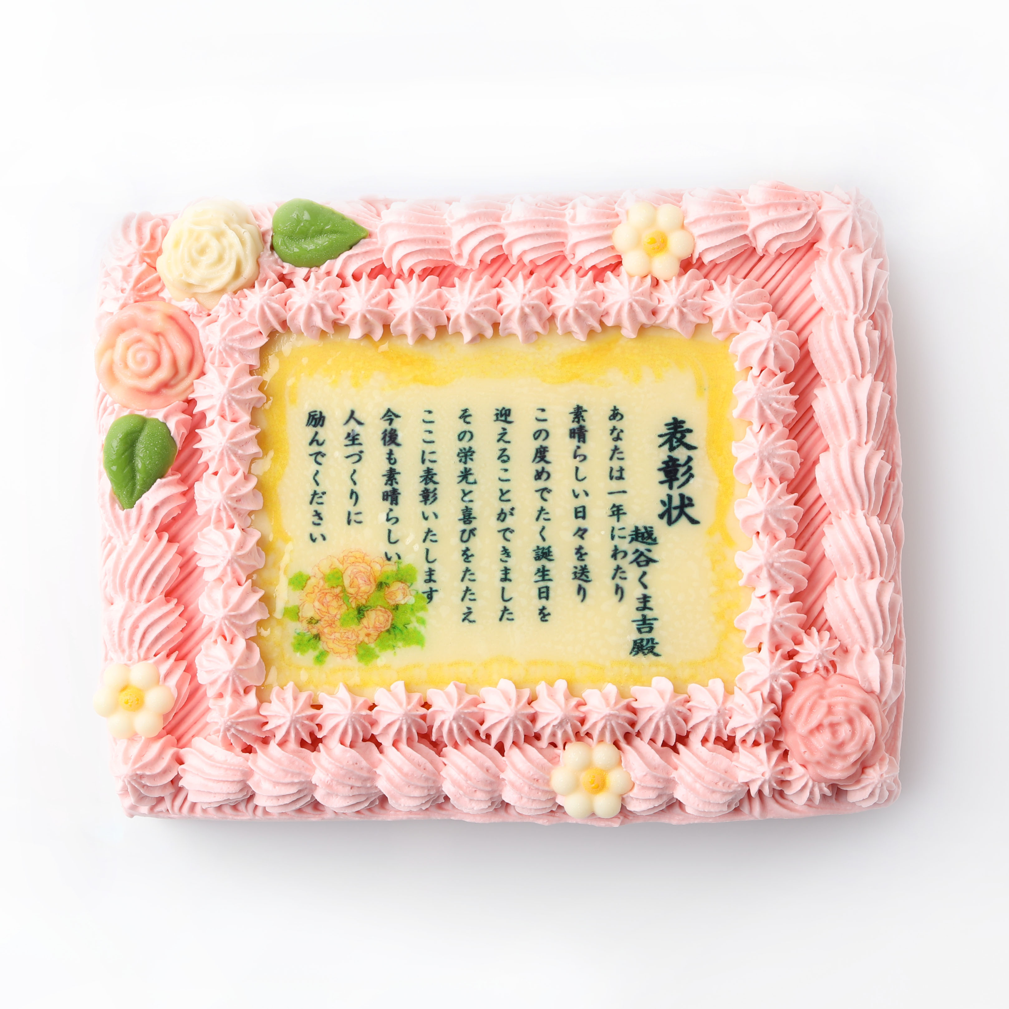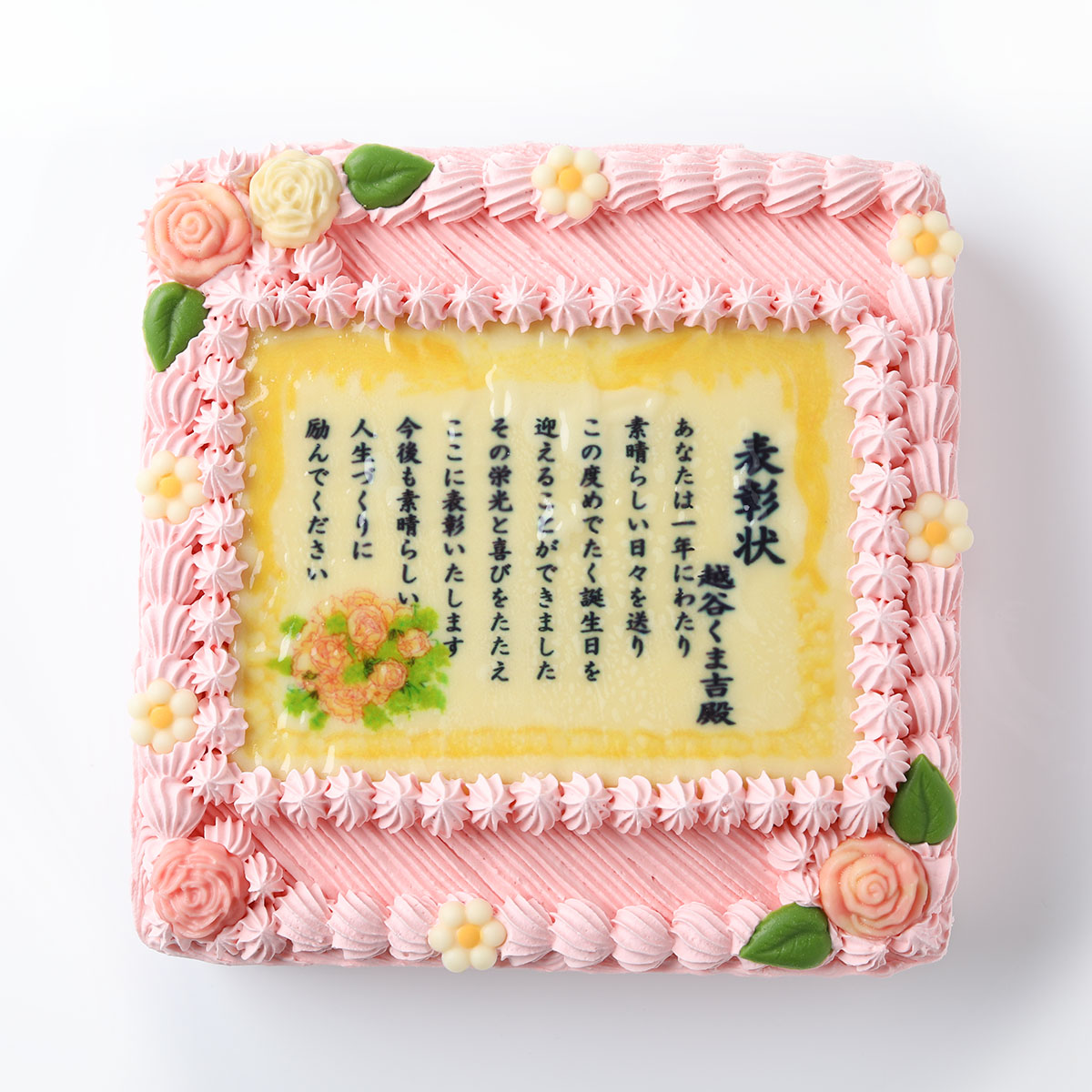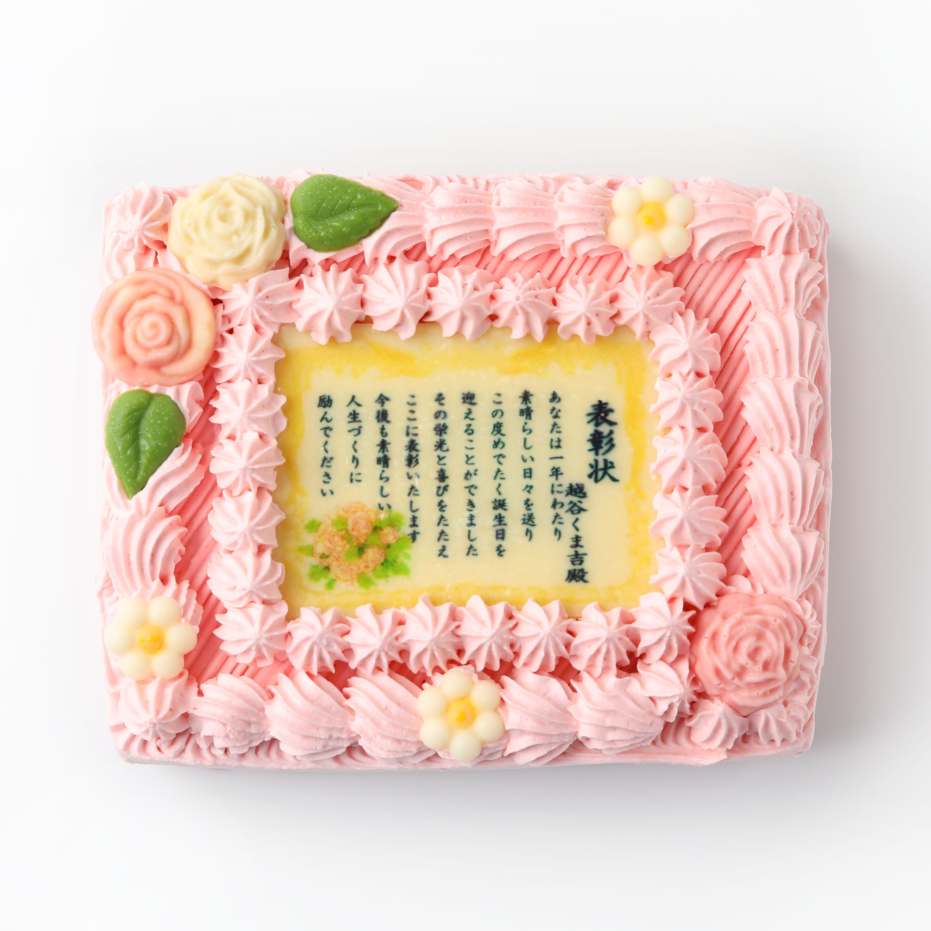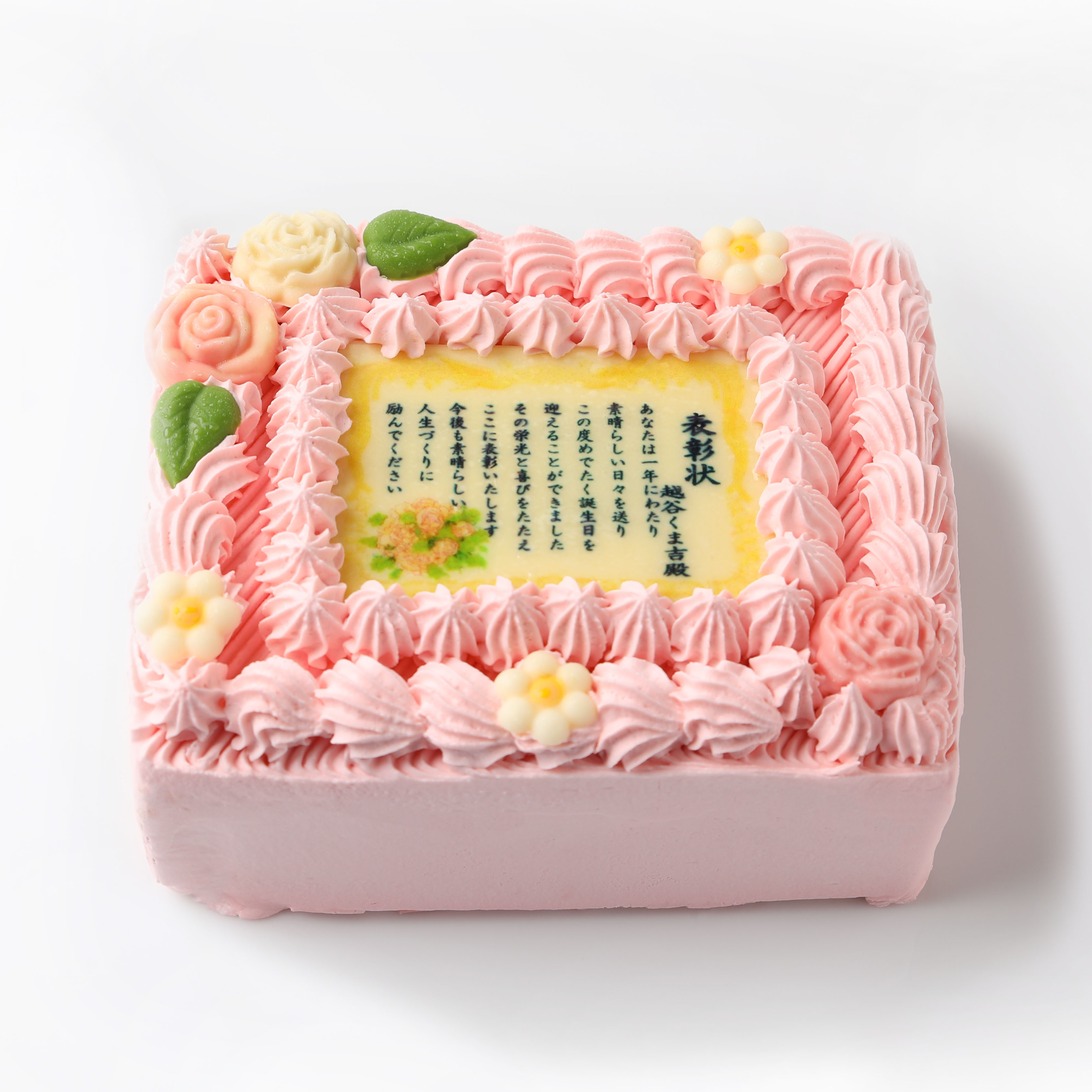 華やかな印象のピンクカラーの表彰状ケーキ。伝えたい思いをケーキで届ければ、きっと喜んでいただけるはず!大切な方への贈り物にぜひご利用ください。
