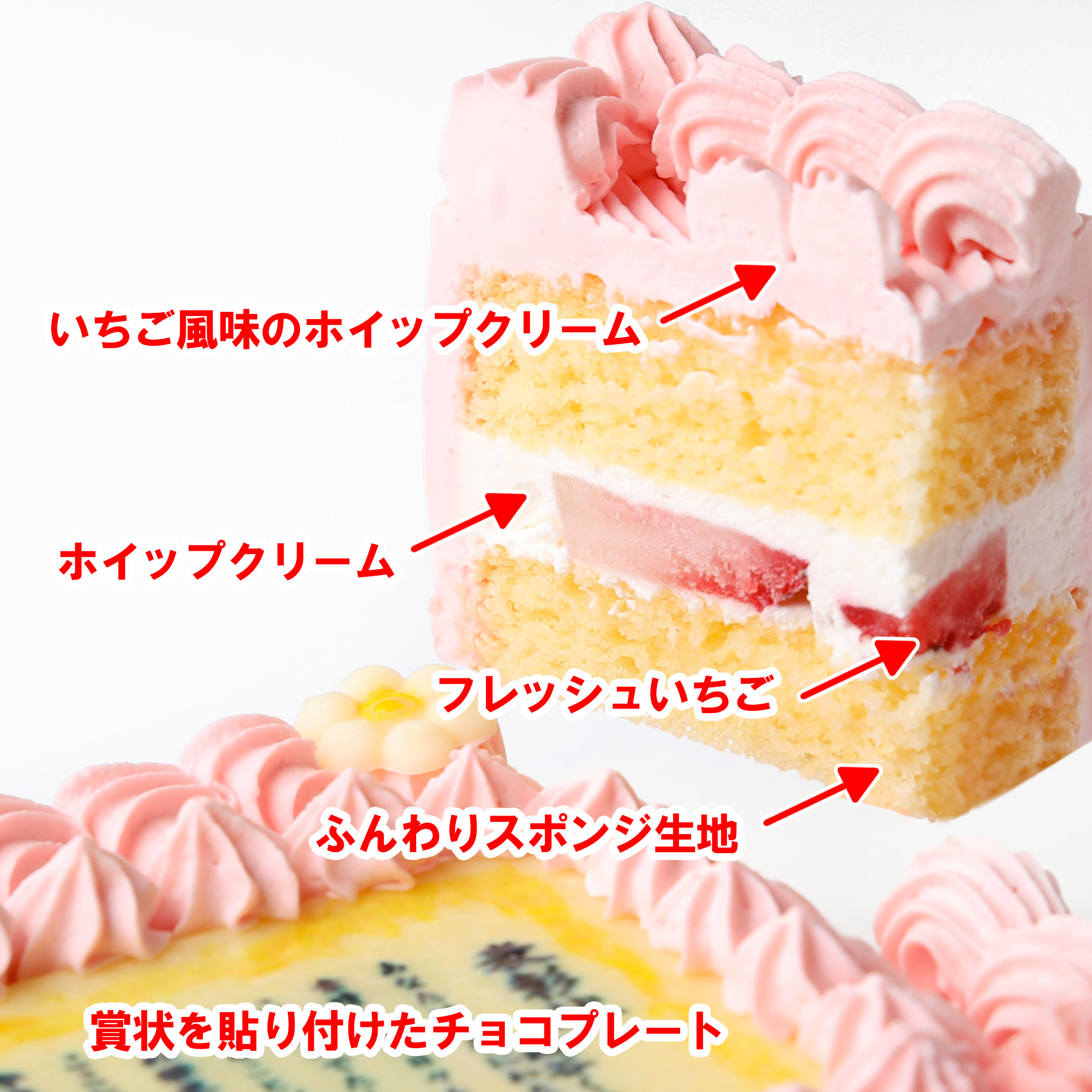お誕生日やイベント、記念日のサプライズギフトなどにぴったりの賞状ケーキ<ピンク>です。メッセージの内容は、数種類のテンプレートからお選びいただくか、お好きな文章での作成が可能!贈る方に合わせて4サイズからお選びいただけます。大切な日のお祝いにぜひご利用ください。