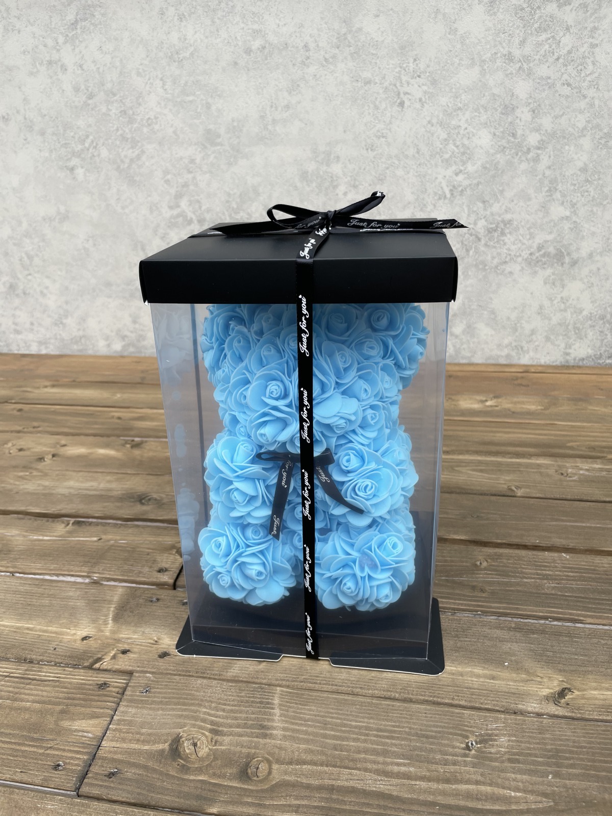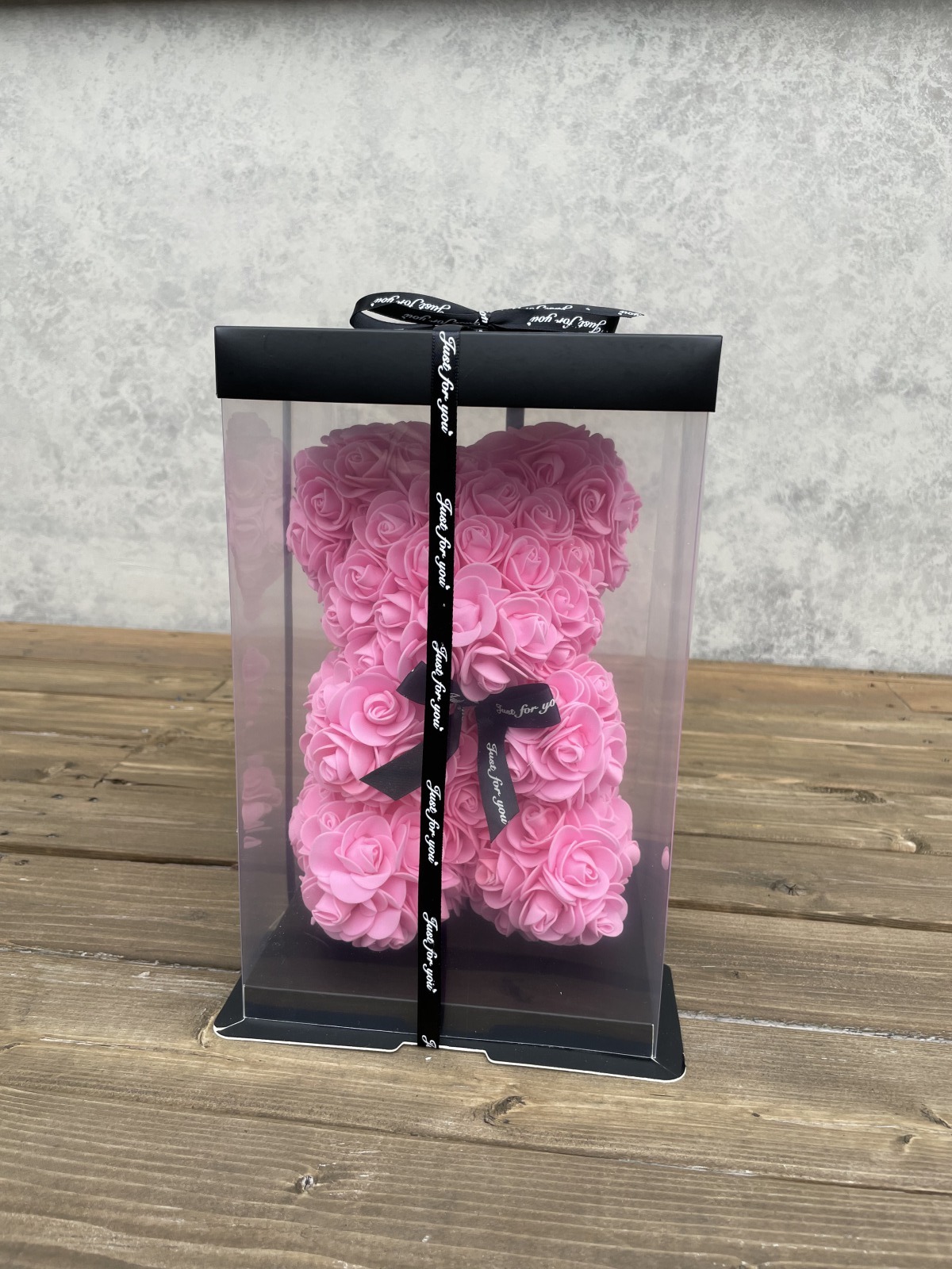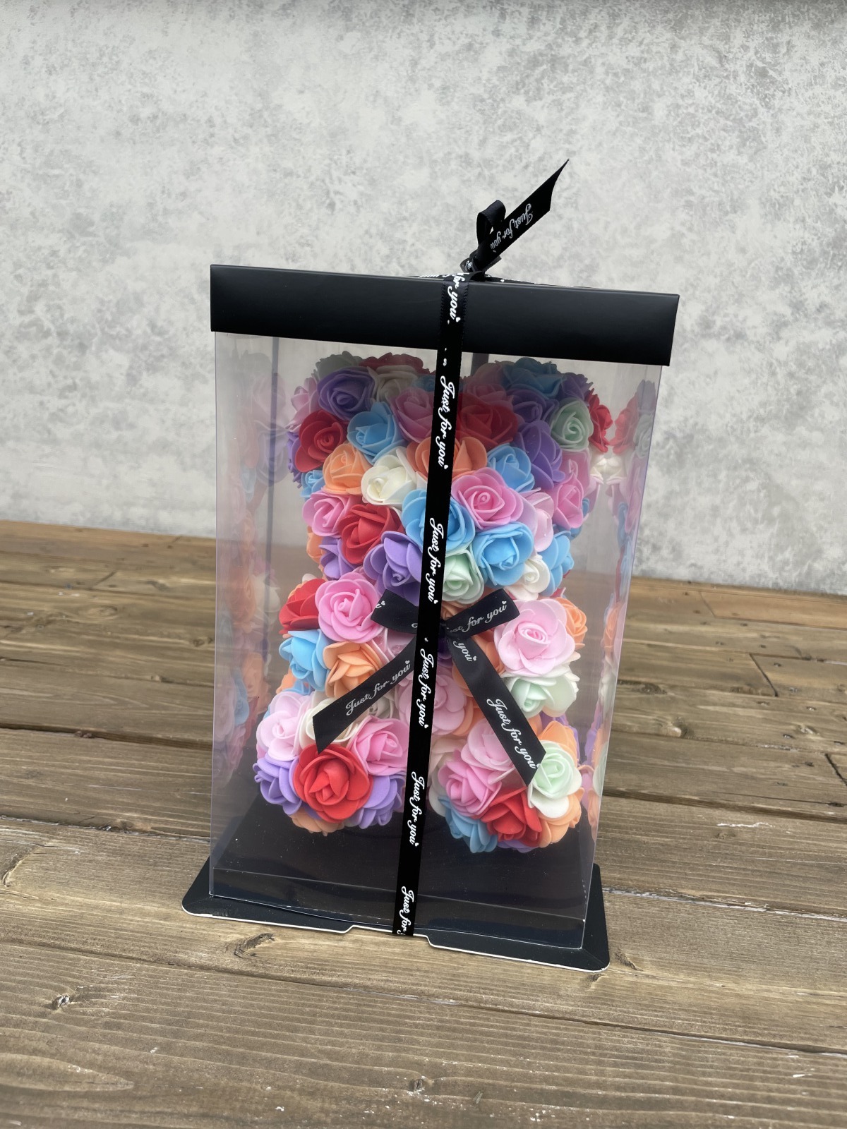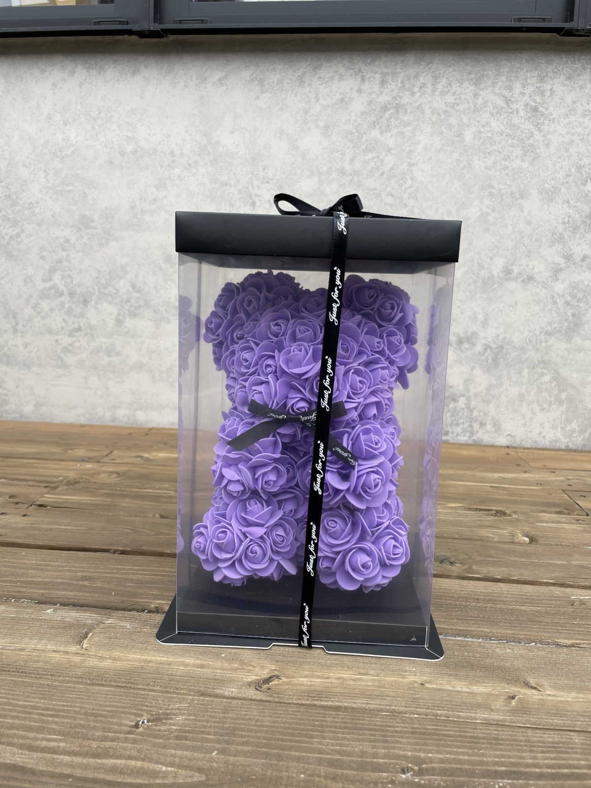 ブレゼントに人気のローズベアにメッセージプレートが付いた特別感のあるギフト。カラーバリエーションも豊富で、贈りたい方に合わせてお選びいただけます。造花なので軽くて持ち運びやすいです。ケース付きなのでそのままインテリアとして飾っていただけます。