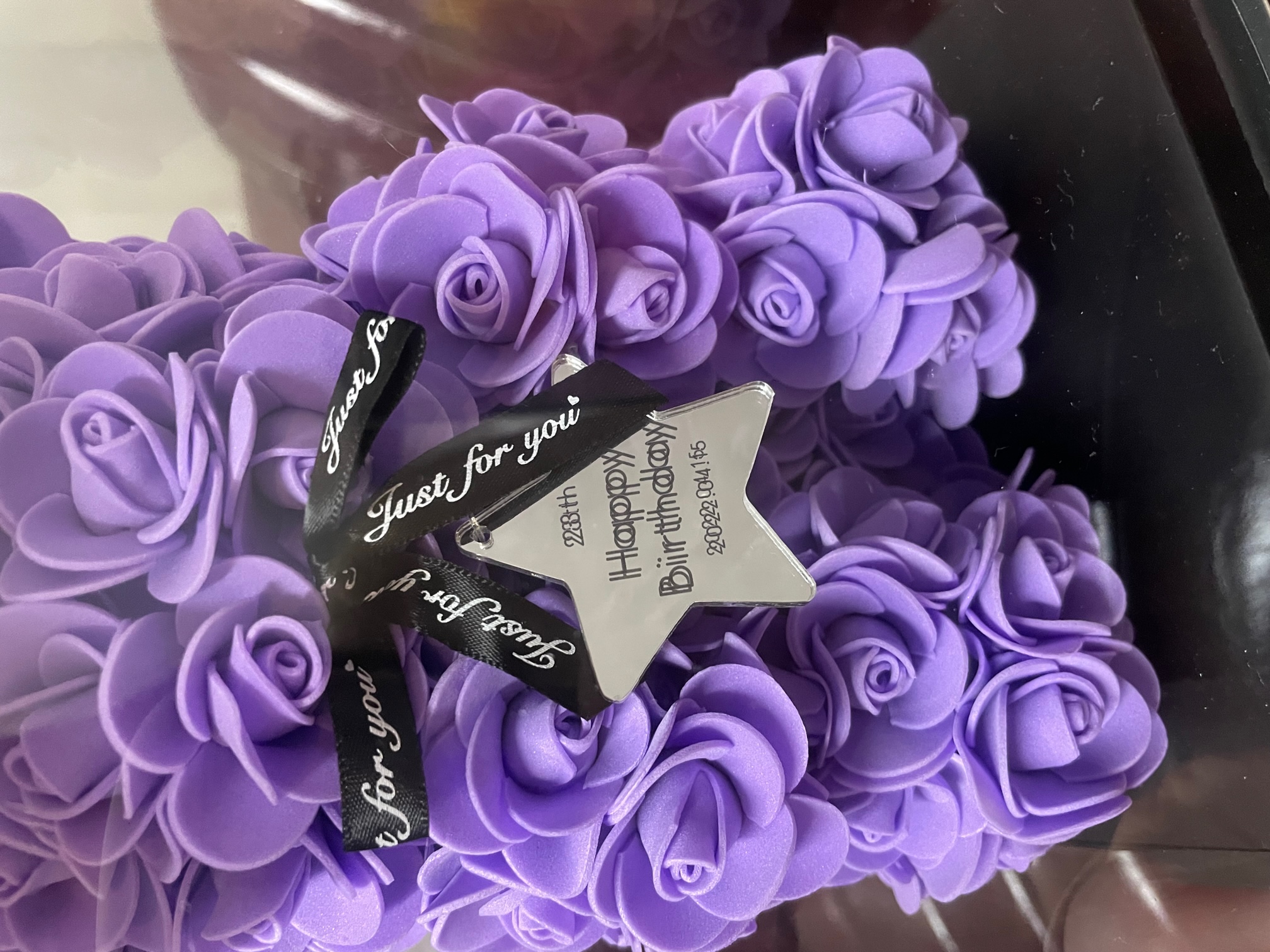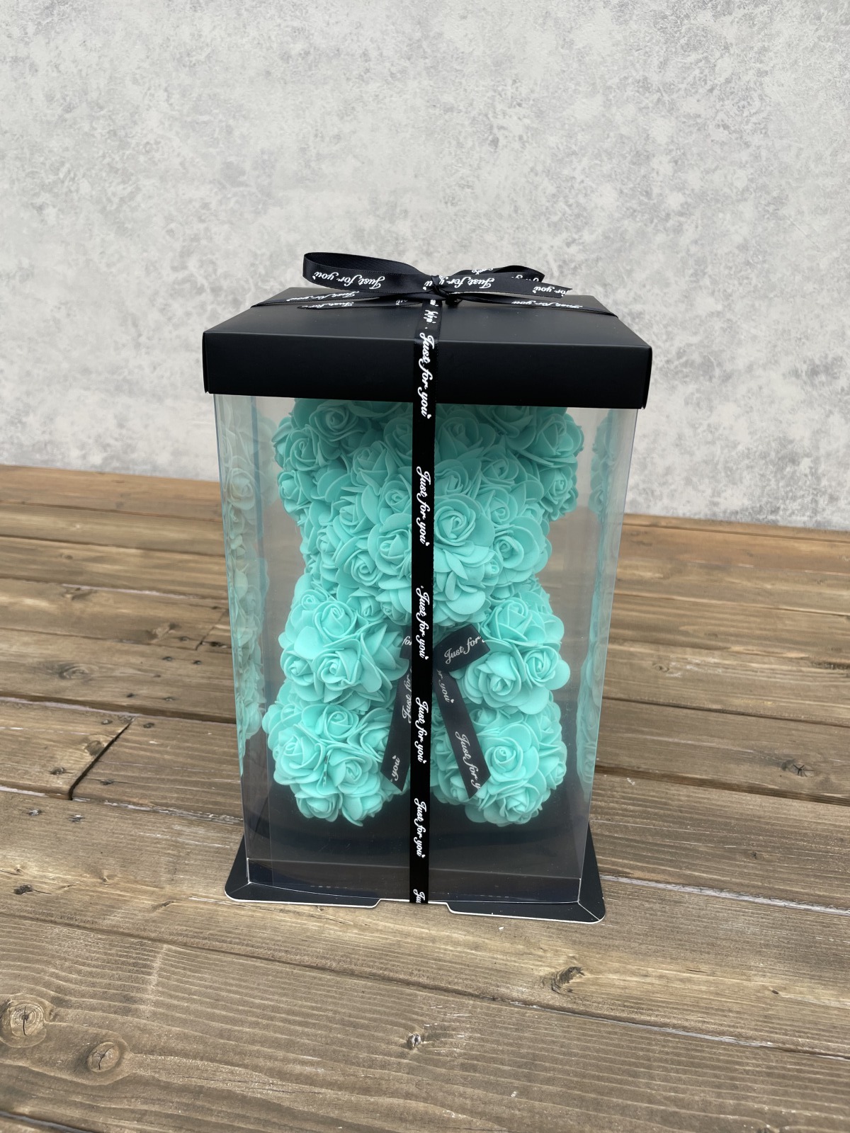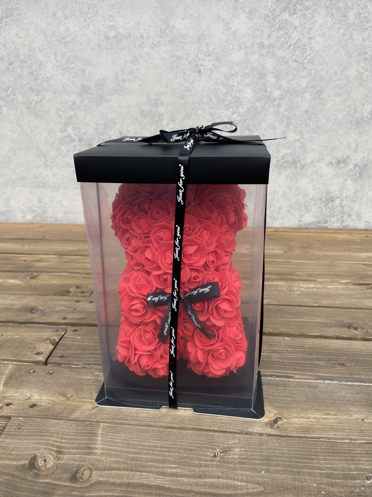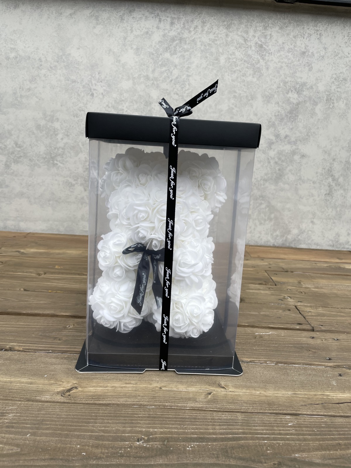 ブレゼントに人気のローズベアにメッセージプレートが付いた特別感のあるギフト。カラーバリエーションも豊富で、贈りたい方に合わせてお選びいただけます。造花なので軽くて持ち運びやすいです。ケース付きなのでそのままインテリアとして飾っていただけます。