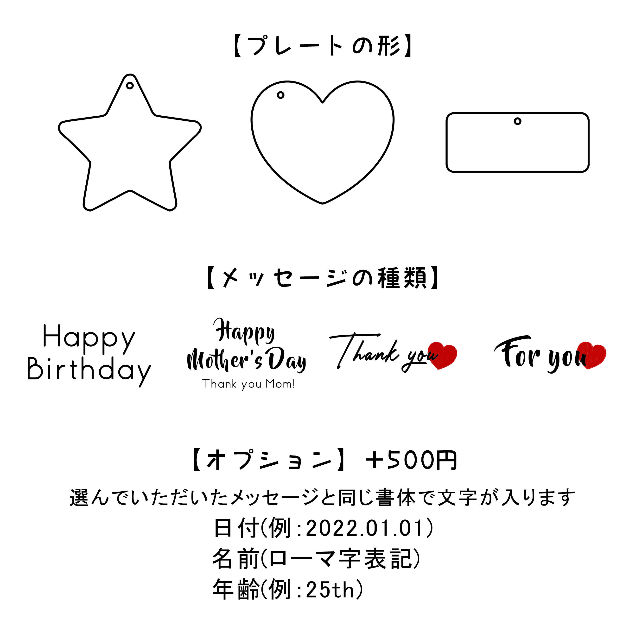 | メッセージプレート | 全てに付属 ①プレートの形 ハート・星・長方形 ②Happy Birthday,Thank You,Happy Mather's Day,For You ※追加で文字入れ可能(有料オプション) 既定メッセージ以外、日にちもしくは年齢の個別の文字 |