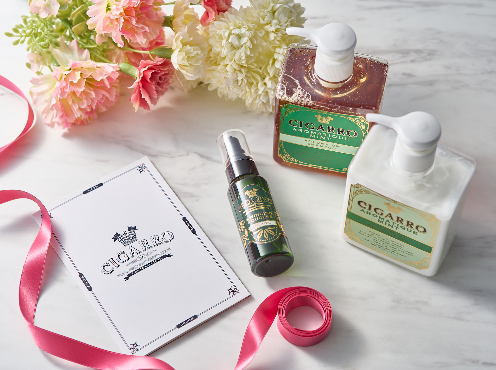「CIGARRO(シガーロ)」の男性のためのヘアケアセット。身も心もリフレッシュできる爽やかなミントの香りのボリュームアップシャンプー・コンディショナーと、髪の乾燥を防ぎ潤いを与えるヘアオイルのセットです。クラシックなデザインのおしゃれなパッケージで贈り物にもぴったり!