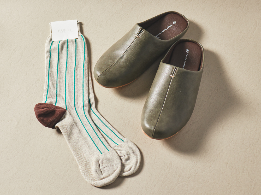 「FRONTIER(フロンティア)」の靴を作るときと同じように一足ずつ靴型を使って丁寧に製造し“歩く”を考えたスリッパと、「FAB.IT(ファブイット)」の稀少なハイゲージパイル機で丁寧に編み立てた心地よいソックスを詰め込んだ、タンプ限定セットです。