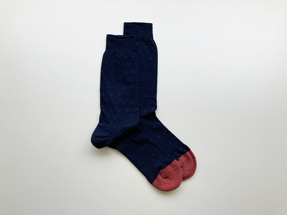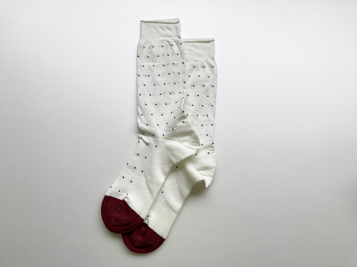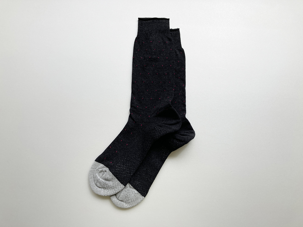 履口の締め付けをゆるくし、尚かつズレにくくする事で、優しく足に馴染んでストレスフリーな履き心地です。 カカトから下へサポート機能を入れる事で、足を包み込むようなフィット感。足と靴下のズレ防止と足への負担を軽減します。 ロッソ部分がリンキング縫製なので、縫い目がフラットでゴロつきがなく長時間履いても不快感が少ない構造です。 足底に極細で柔らかなマイクロパイルを入れ優れたクッション性を生み足への負担を軽減します。足底に滑り止めを入れる事で靴底のインソールと靴下の滑りを防ぎ、吸い付くような履き心地です。 パッケージ裏に靴下の機能を説明してますので、ギフトでもらった方も靴下の機能性を確認できます。