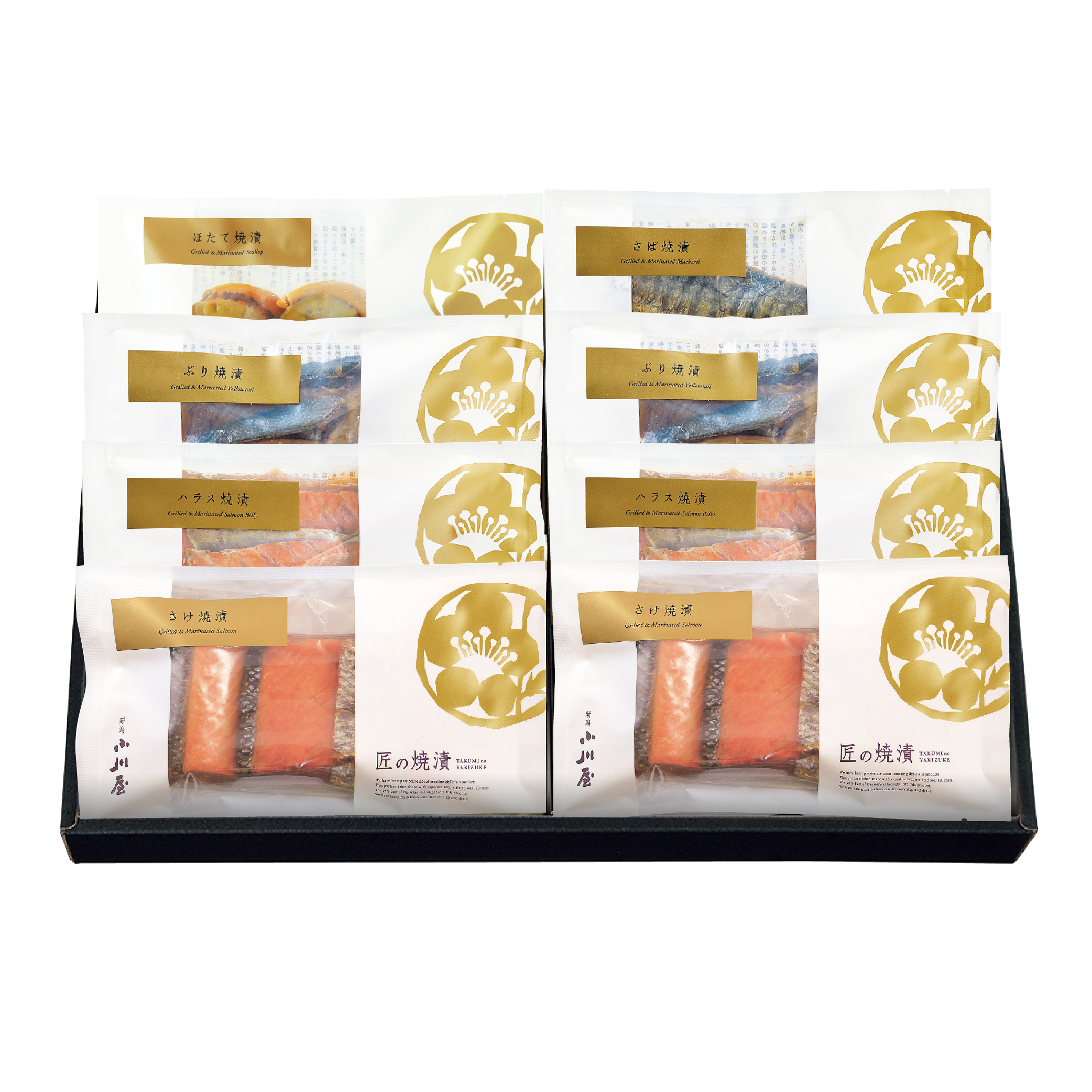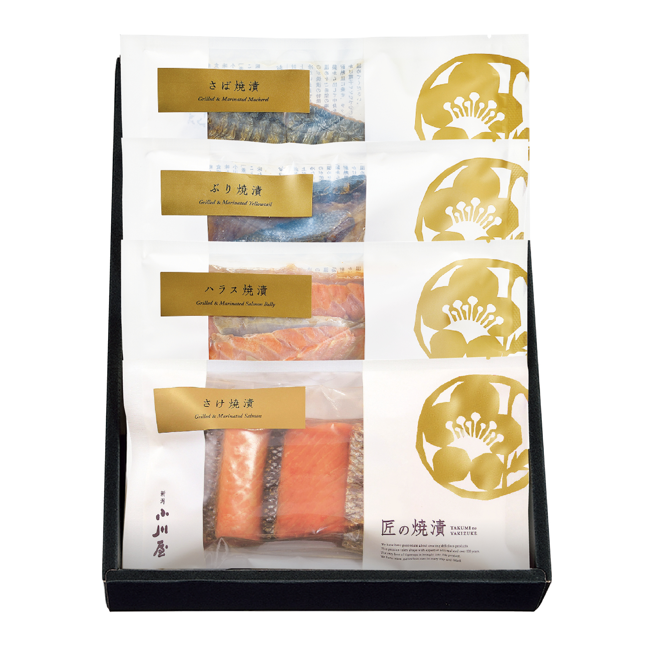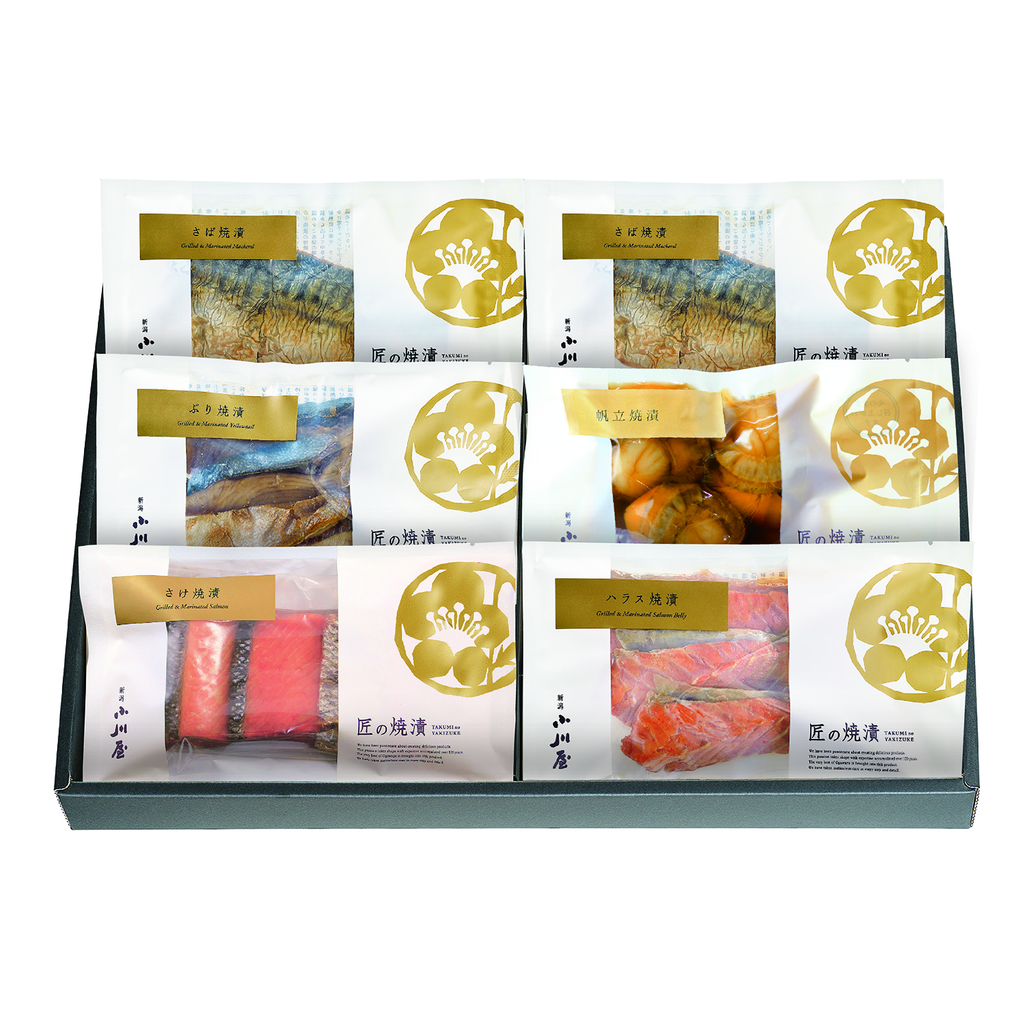 大口注文・法人のお問い合わせはこちら古くから新潟に伝わる郷土料理「焼漬」です。 白焼きした魚介を醤油・酒・味醂のタレに漬け、素材の美味しさを引き出しました。 『匠の焼漬』に使用している小川屋秘伝のタレは、どこか懐かしい“甘じょっぱい”味わいに仕上がっております。