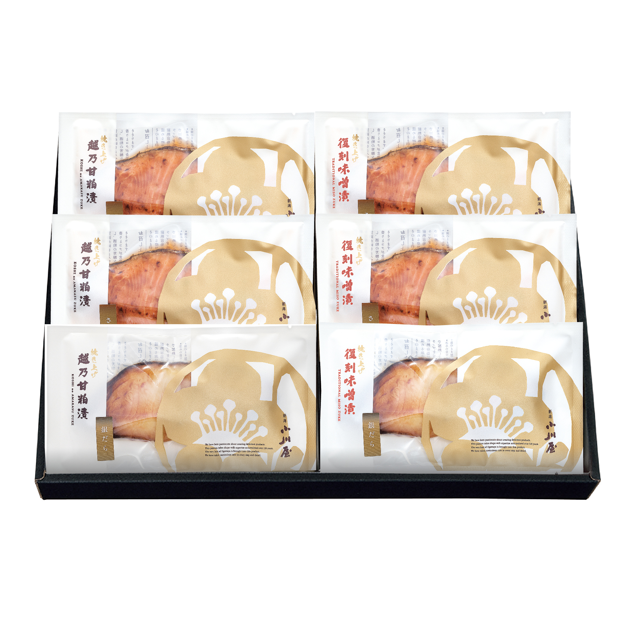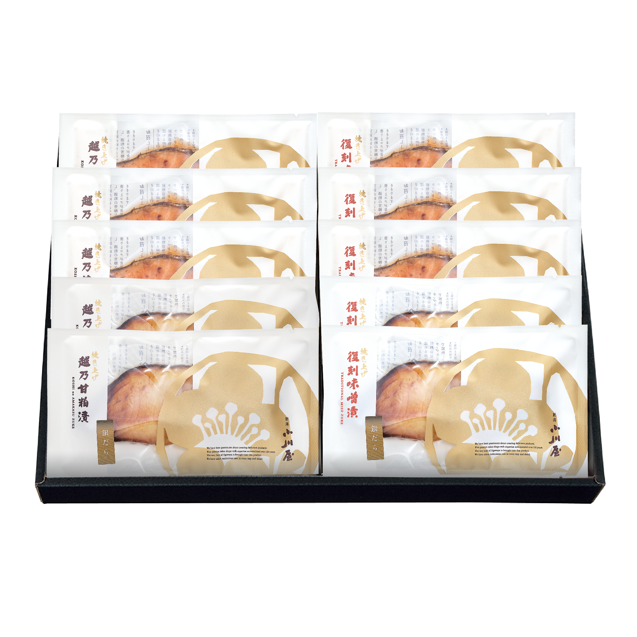 明治26年(1893年)創業の小川屋の看板商品、漬け魚の焼き上げシリーズ「越乃甘粕漬」と「復刻味噌漬」の詰め合わせです。
