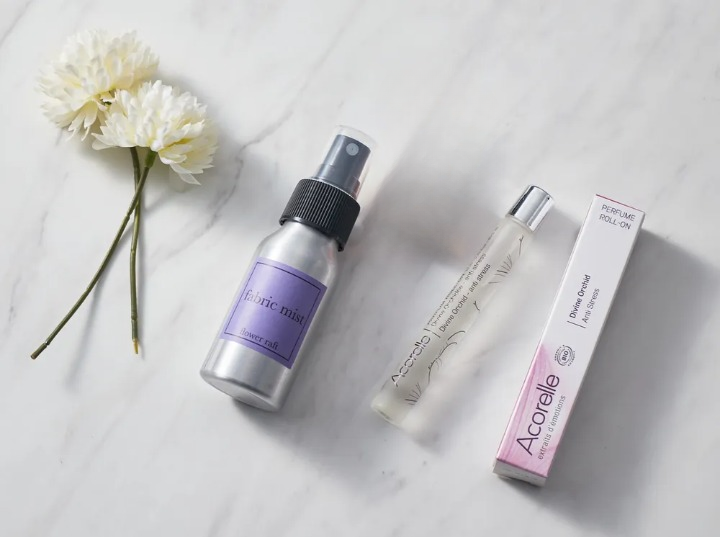 天然成分を使った「flower raft(フラワーラフト)」のファブリックミストと、オーガニック香水でありながらしっかり香る「Acorelle(アコレル)」のロールオンタイプの香水がセットになりました。素敵な香りをお楽しみください。