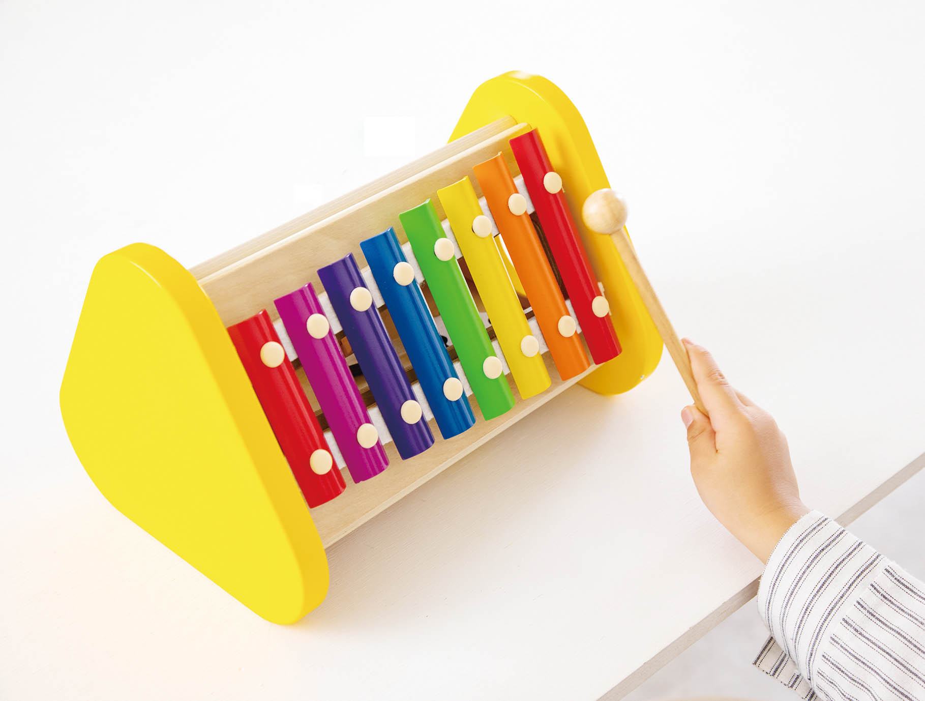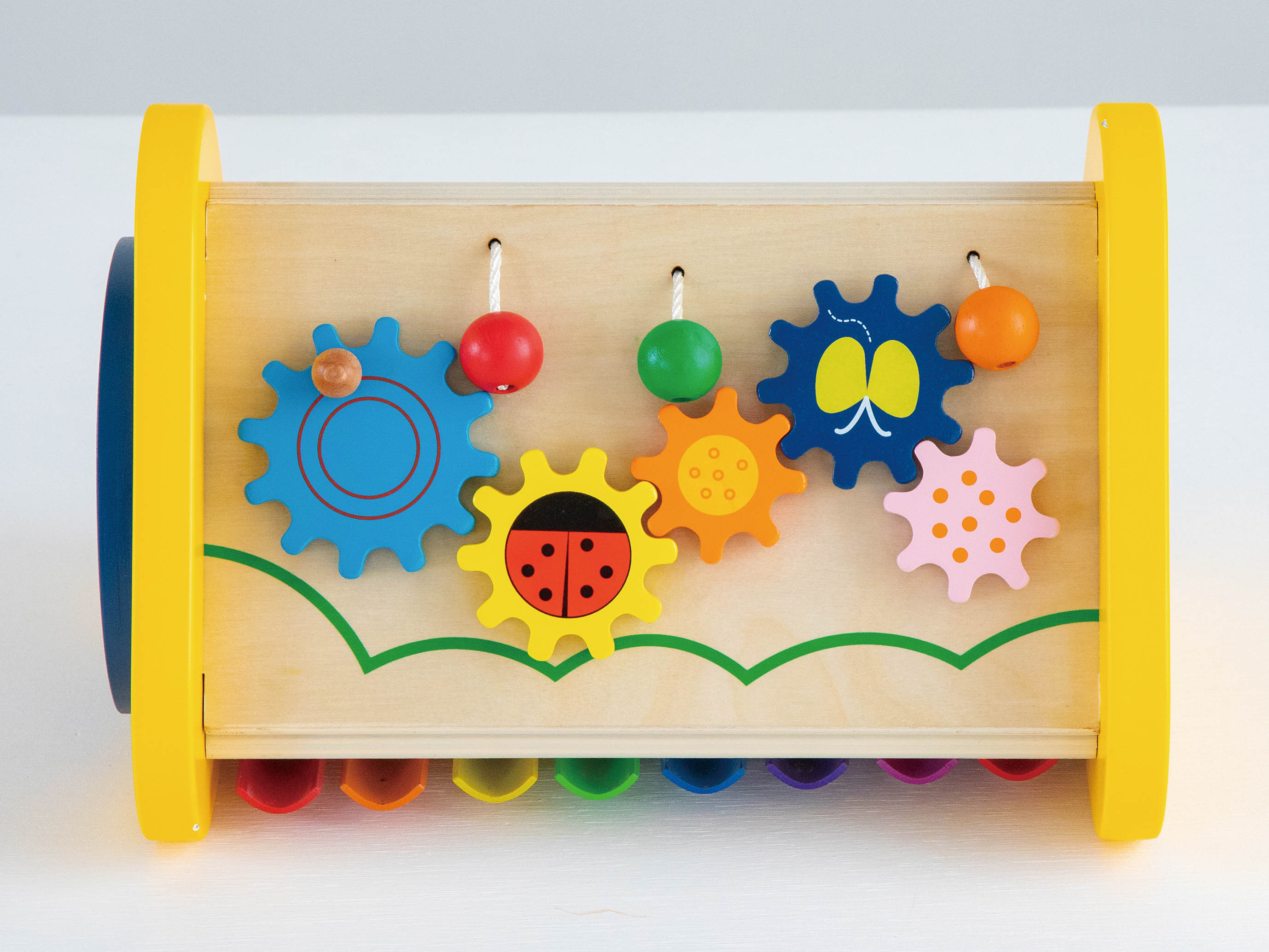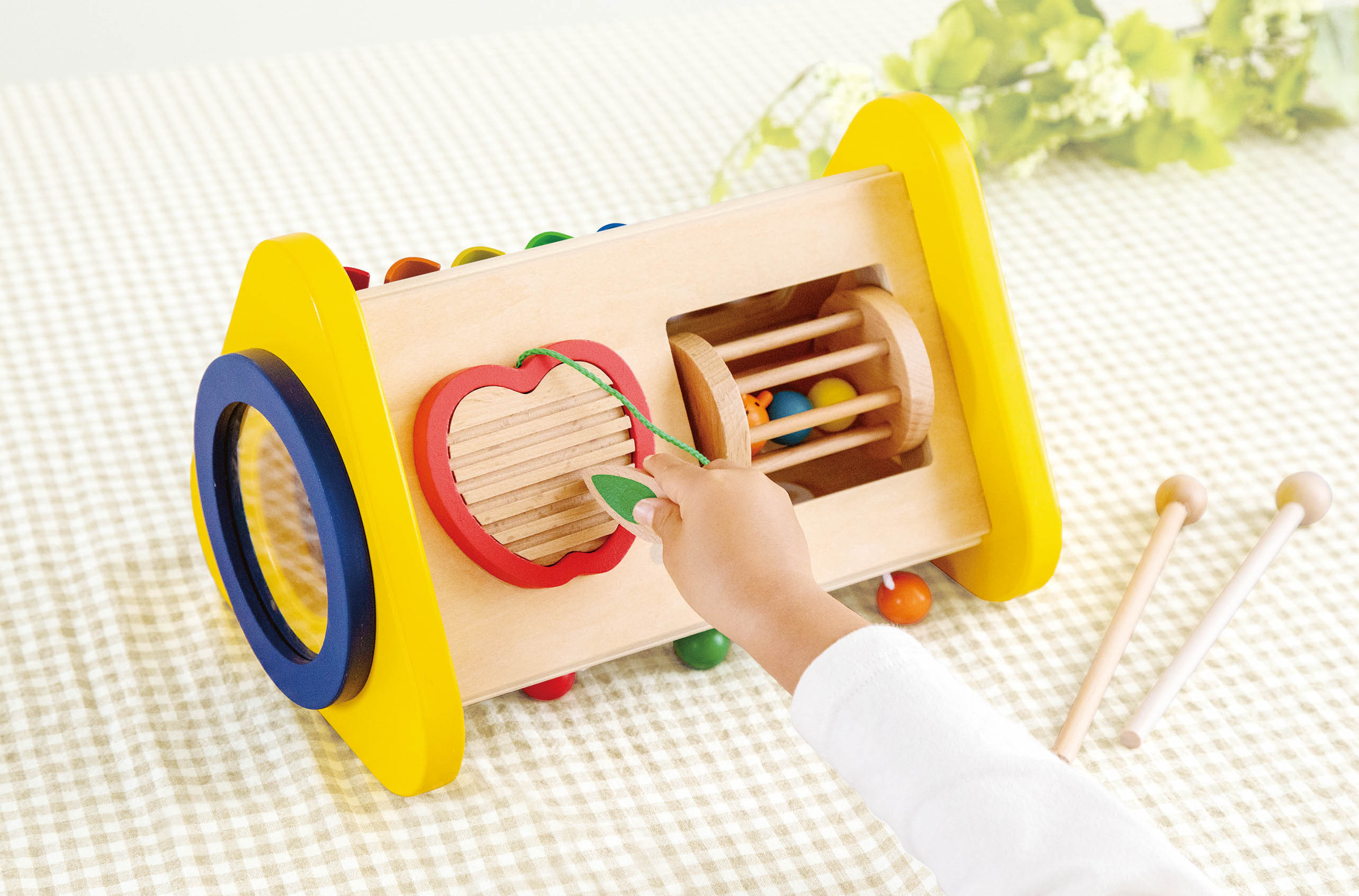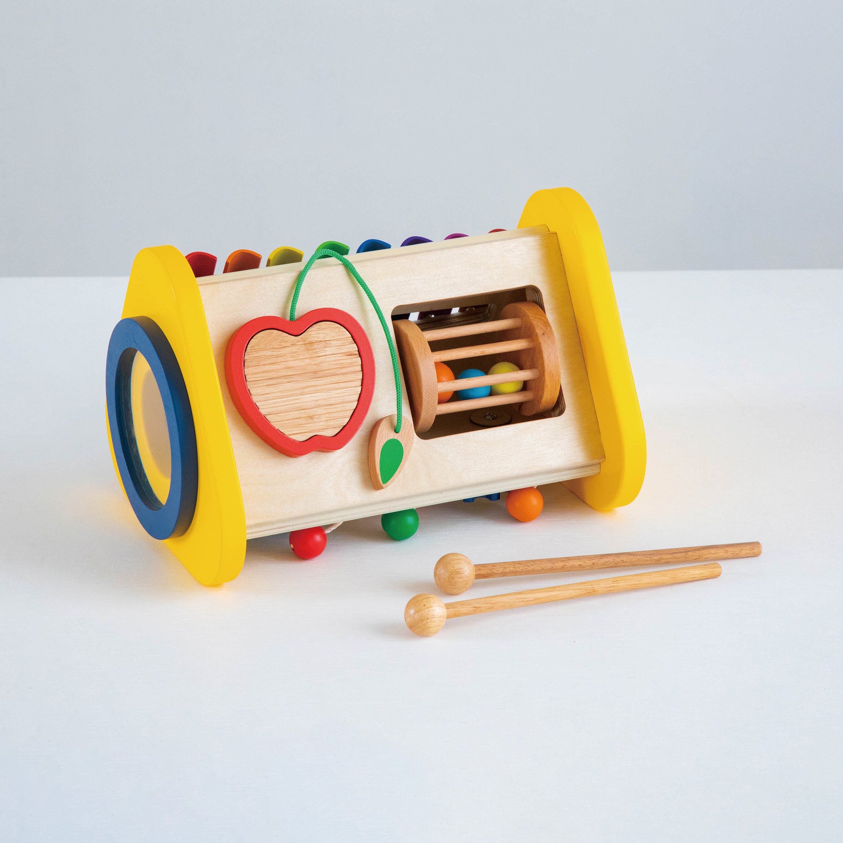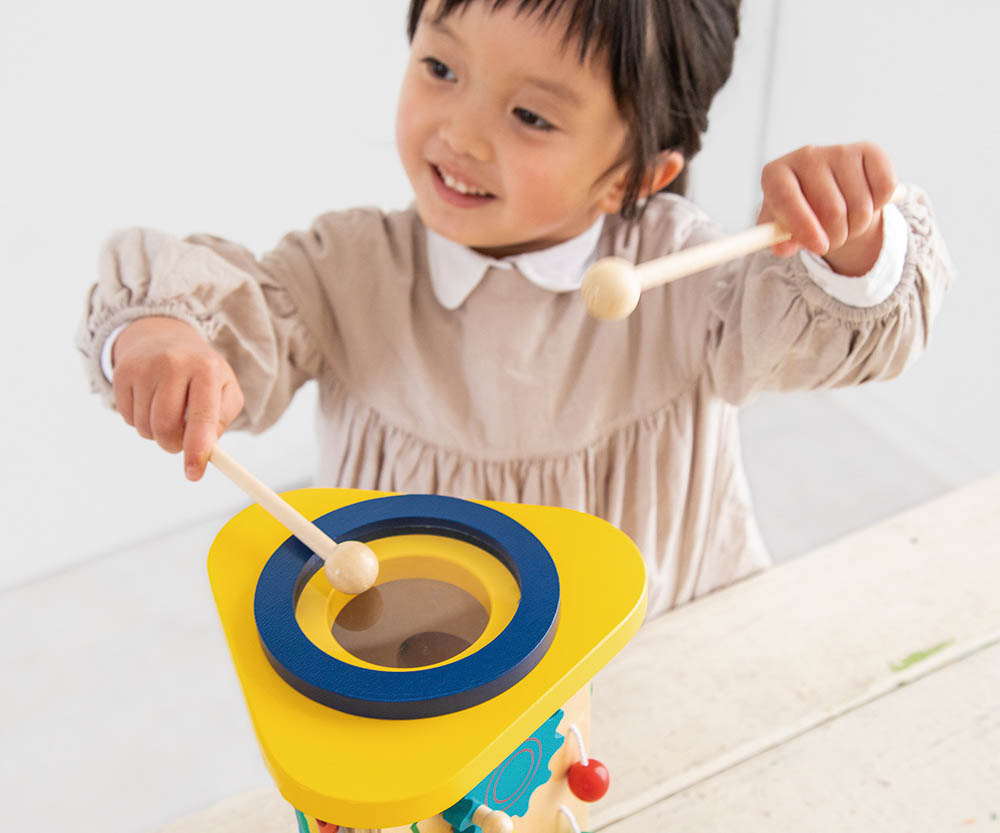 ドラム・シロフォン・ギロ・ラトル・歯車の五つの音を聞くことができるおもちゃです。「たたく」「回す」「こする」という動作から音が出る楽しさを自分で発見し、音の違いも自然に理解していきます。音あそびを通して、音感を優しく、情緒を豊かに育みます。