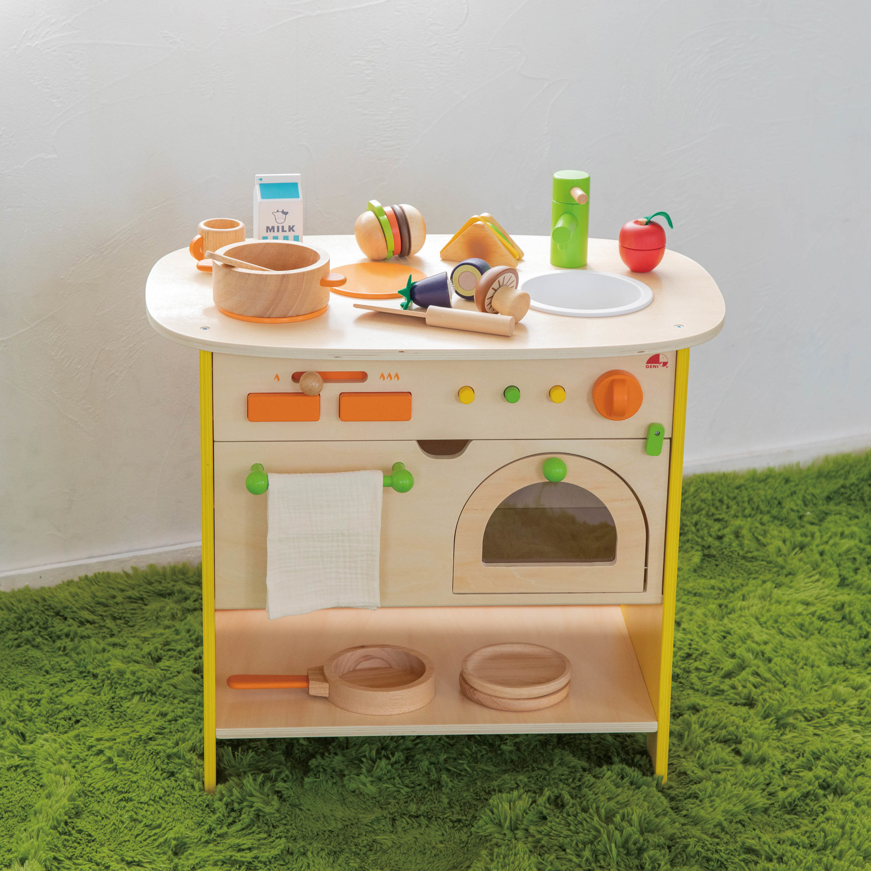 大口注文・法人のお問い合わせはこちらコミュニケーションツールとして遊べるアイランド型(対面型)のキッチンです。 本体後ろには本などを収納できるスペースがあり収納棚としても使用できます。 天板の上に壁がないため、キッチンを挟んで向かい合って遊べます。 ●対象年齢:3歳〜