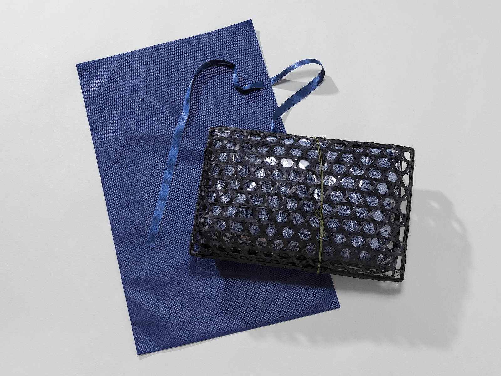 六ツ目から中が見える、蓋付の竹籠に甚平をお入れいたします。特別感が増すので大切な方への贈り物にぴったり。 竹籠はさらに不織布のラッピング巾着袋にお入れしてお届けするので、そのまま相手の方にお渡しいただくことができます。ラッピング巾着袋は、ボルドー、ネイビー、ベージュの3色からお好きな色をお選びください。