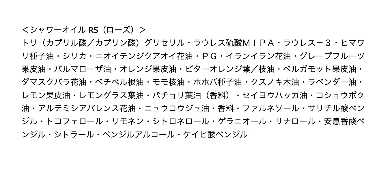 | 商品本体重量 | 【RS バスアンドシャワーオイル】 16.7g 【シャワーオイル RS】 29.2g |