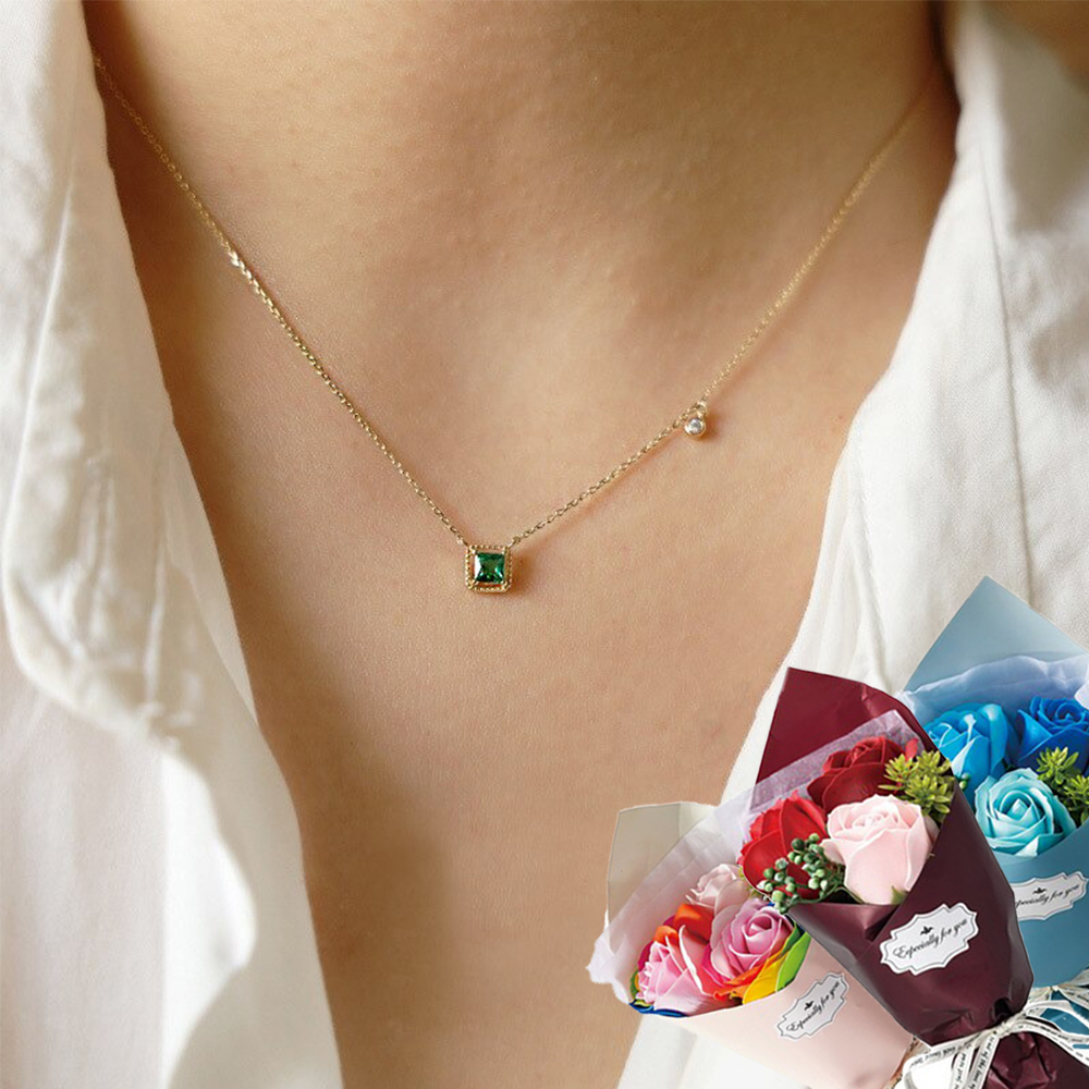 グリーンストーンが可愛らしいネックレスです。デコルテにきらっと光るストーンがシンプルながら目をひきます。ジュエリーだけではなくお花のプレゼントとしても喜んでいただけるようにソープブーケとセットにしました!6色からお選びいただけます。