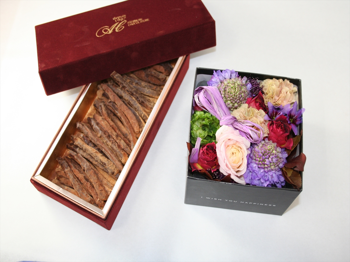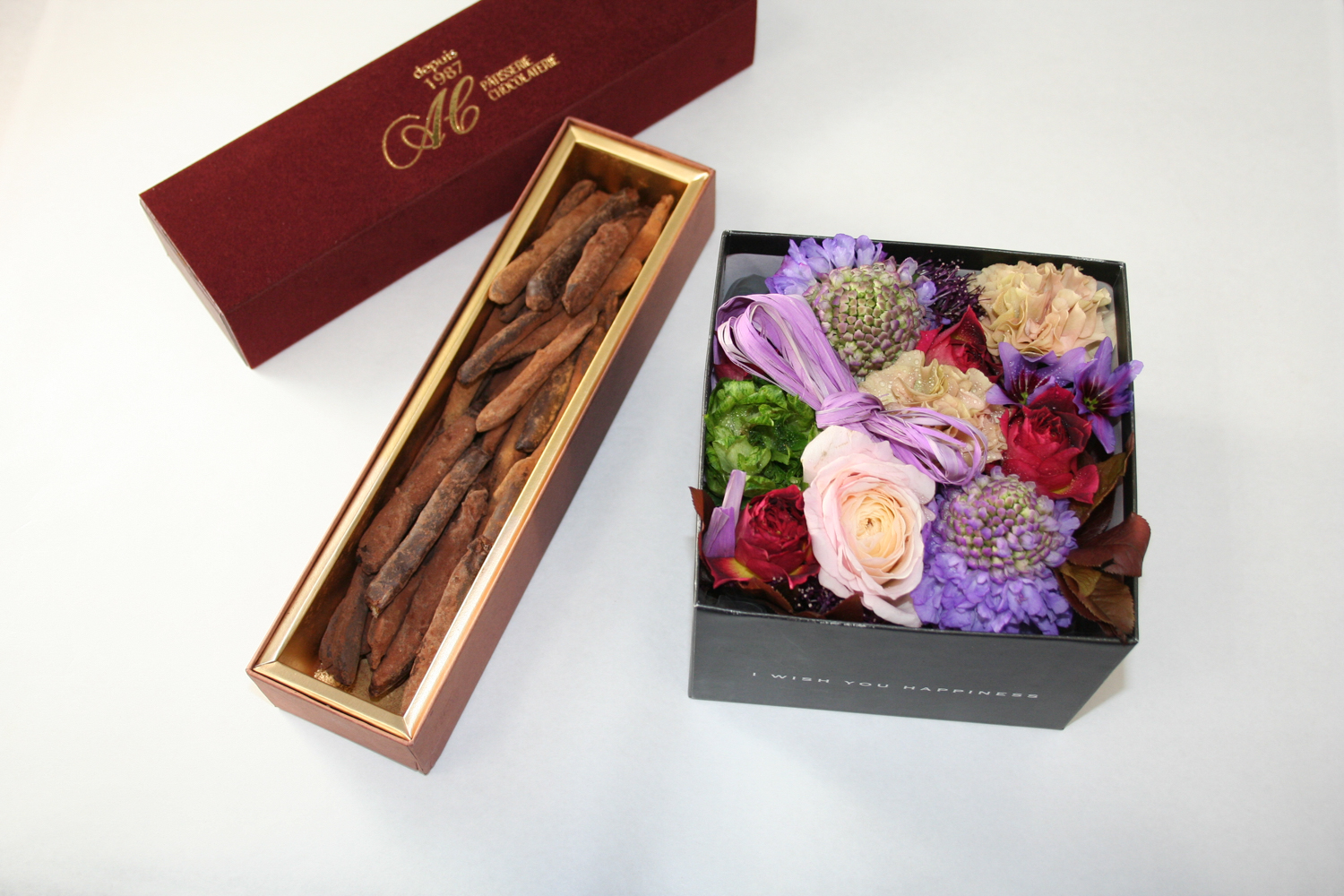 1987年の創業から愛される、おしゃれなフランス菓子のお店「アントワーヌ・カレーム」のオランジェットとフラワーボックスのセットです。じっくり煮つめたスティック状のオレンジピールを、チョコレートコーティングしました。ほろ苦さとチョコレートの甘さのバランスは自慢の逸品です。